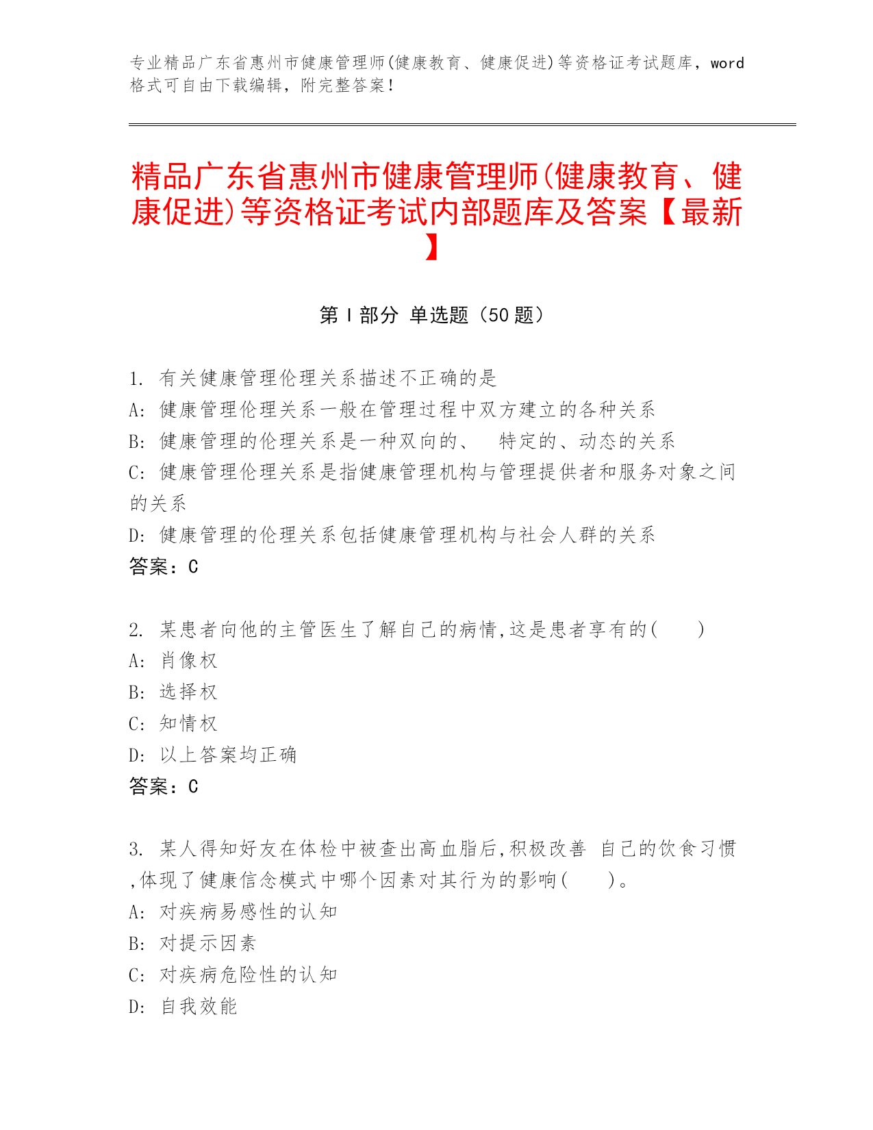专业精品河南省郑州市健康管理师(健康教育、健康促进)等资格证考试题库,word格式可自由下载编辑,附完整答案!内部培训河南省郑州市健康管理师(健康教育、健康促进)等资格证考试通用题库汇编第I部分单选题(50题)1.个人健康危险因素的资料不包括()A:生物遗传因素与环境因素资料B:个人收入资料C:行为生活方式资料D:疾病史与医疗卫生服务资料答案:B2.关于前列腺特异性抗原(PSA)的说法不正确的是()。A:前列腺增生也会引起PSA升高B:PSA是一种来源于男性前列腺细胞的蛋白质C:PSA水平过高,可作为前列