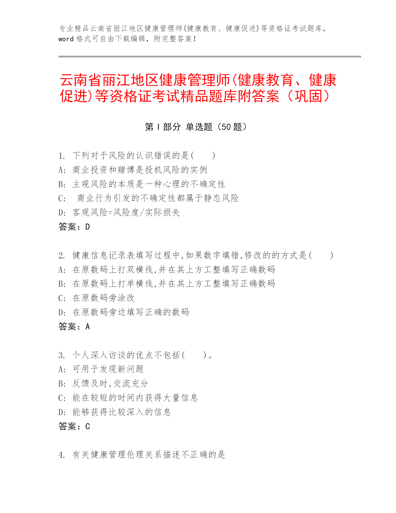 云南省丽江地区健康管理师(健康教育、健康促进)等资格证考试精品题库附答案(巩固).docx