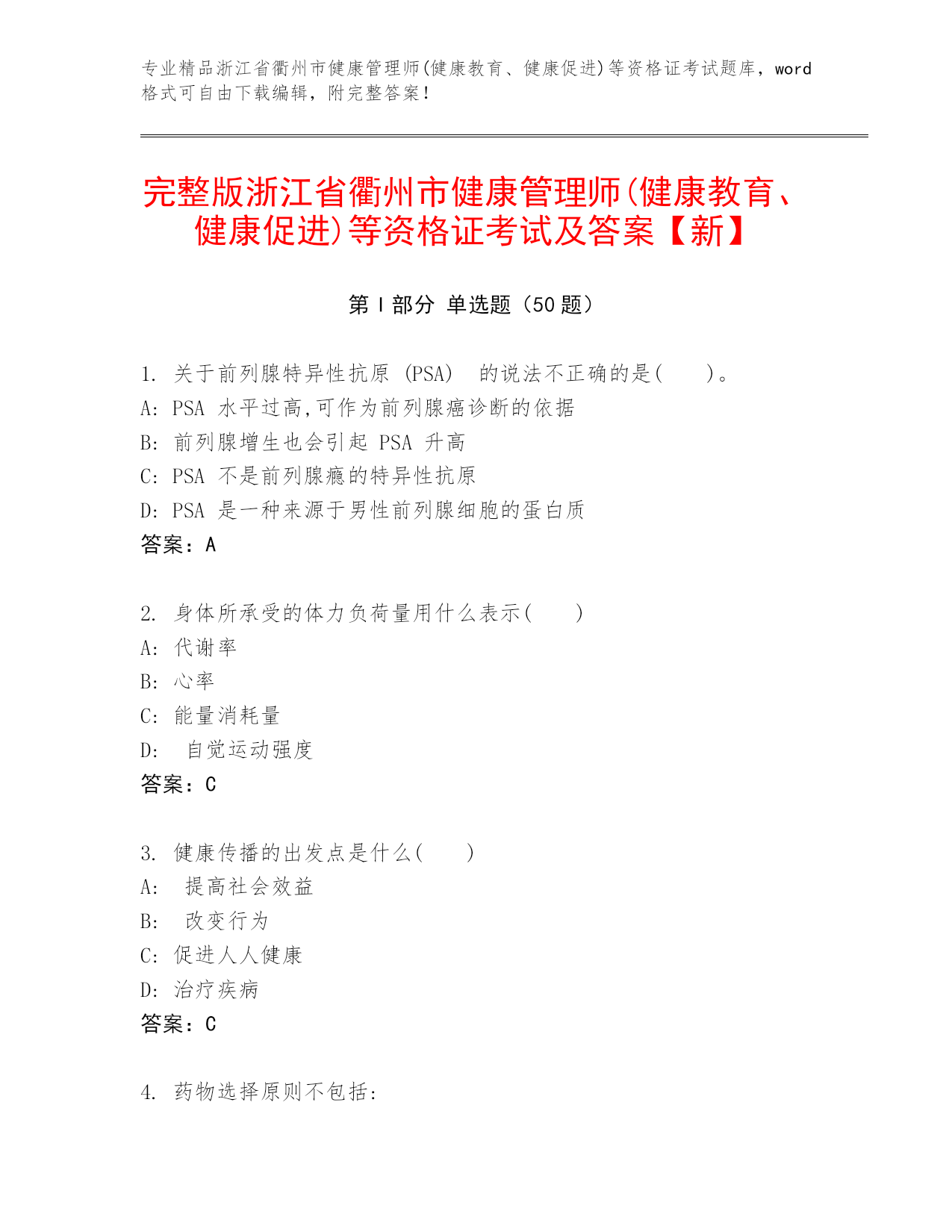 专业精品浙江省衢州市健康管理师(健康教育、健康促进)等资格证考试题库,word格式可自由下载编辑,附完整答案!完整版浙江省衢州市健康管理师(健康教育、健康促进)等资格证考试及答案【新】第I部分单选题(50题)1.关于前列腺特异性抗原(PSA)的说法不正确的是()。A:PSA水平过高,可作为前列腺癌诊断的依据B:前列腺增生也会引起PSA升高C:PSA不是前列腺瘾的特异性抗原D:PSA是一种来源于男性前列腺细胞的蛋白质答案:A2.身体所承受的体力负荷量用什么表示()A:代谢率B:心率C:能量消耗量D:自觉运动