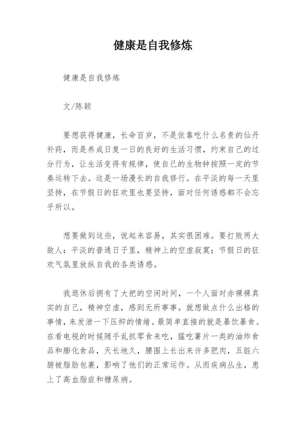 健康是自我修炼健康是自我修炼文/陈颖要想获得健康,长命百岁,不是依靠吃什么名贵的仙丹补药,而是养成日复一日的良好的生活习惯,约束自己的过分行为,让生活变得有规律,使自己的生物钟按照一定的节奏运转下去。这是一场漫长的自我修行。在平淡的每一天里坚持,在节假日的狂欢里也要坚持,面对任何诱惑都不会忘乎所以。想要做到这些,说起来容易,其实很困难。要打败两大敌人:平淡的普通日子里,精神上的空虚寂寞;节假日的狂欢气氛里放纵自我的各类诱惑。我退休后拥有了大把的空闲时间,一个人面对赤裸裸真实的自己,精神空虚,感到无所事事。