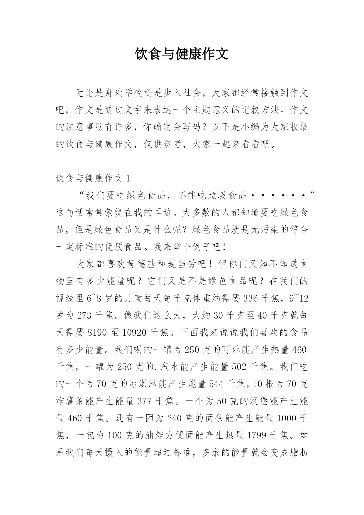 饮食与健康作文无论是身处学校还是步入社会,大家都经常接触到作文吧,作文是通过文字来表达一个主题意义的记叙方法。作文的注意事项有许多,你确定会写吗?以下是小编为大家收集的饮食与健康作文,仅供参考,大家一起来看看吧。饮食与健康作文1“我们要吃绿色食品,不能吃垃圾食品······”这句话常常萦绕在我的耳边。大多数的人都知道要吃绿色食品,但是绿色食品又是什么呢?绿色食品就是无污染的符合一定标准的优质食品。我来举个例子吧!大家都喜欢肯德基和麦当劳吧!但你们又知不知道食物里有多少能量呢?它们又是不是绿色食品呢?在我们