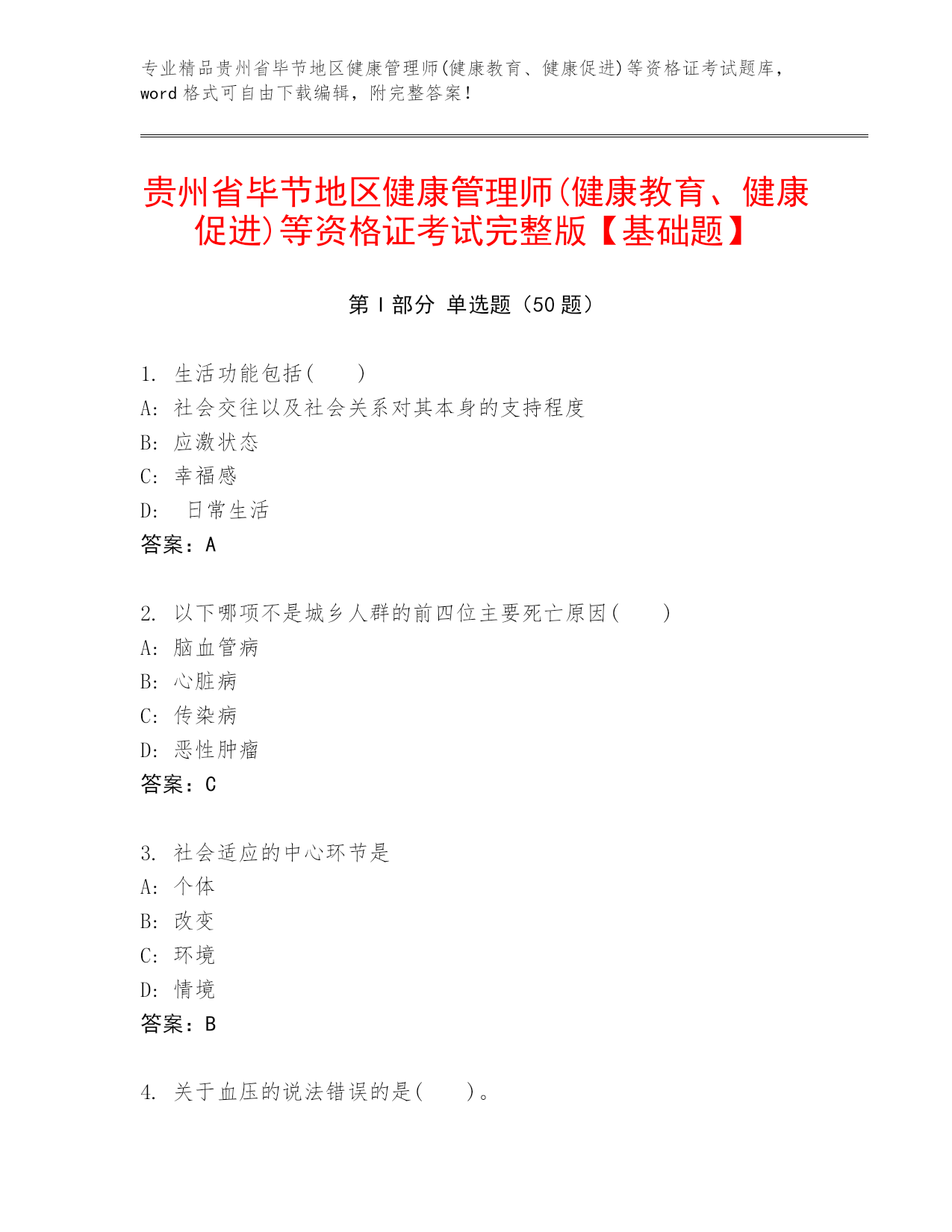 专业精品贵州省毕节地区健康管理师(健康教育、健康促进)等资格证考试题库,word格式可自由下载编辑,附完整答案!贵州省毕节地区健康管理师(健康教育、健康促进)等资格证考试完整版【基础题】第I部分单选题(50题)1.生活功能包括()A:社会交往以及社会关系对其本身的支持程度B:应激状态C:幸福感D:日常生活答案:A2.以下哪项不是城乡人群的前四位主要死亡原因()A:脑血管病B:心脏病C:传染病D:恶性肿瘤答案:C3.社会适应的中心环节是A:个体B:改变C:环境D:情境答案:B4.关于血压的说法错误的是()。
