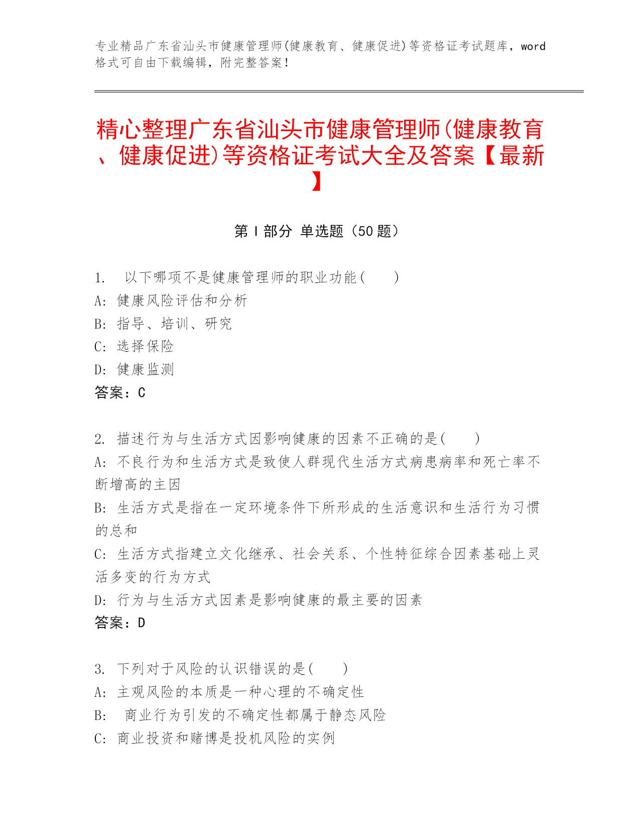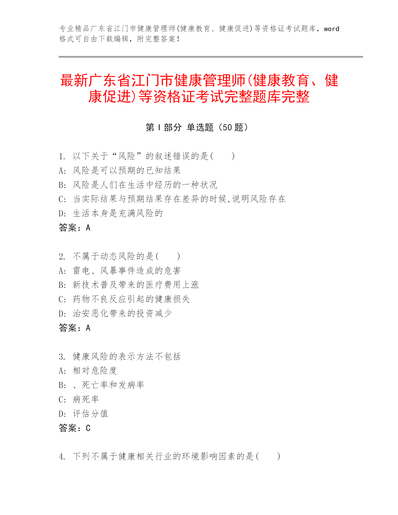 专业精品广东省江门市健康管理师(健康教育、健康促进)等资格证考试题库,word格式可自由下载编辑,附完整答案!最新广东省江门市健康管理师(健康教育、健康促进)等资格证考试完整题库完整第I部分单选题(50题)1.以下关于“风险”的叙述错误的是()A:风险是可以预期的已知结果B:风险是人们在生活中经历的一种状况C:当实际结果与预期结果存在差异的时候,说明风险存在D:生活本身是充满风险的答案:A2.不属于动态风险的是()A:雷电、风暴事件造成的危害B:新技术普及带来的医疗费用上涨C:药物不良反应引起的健康损失D