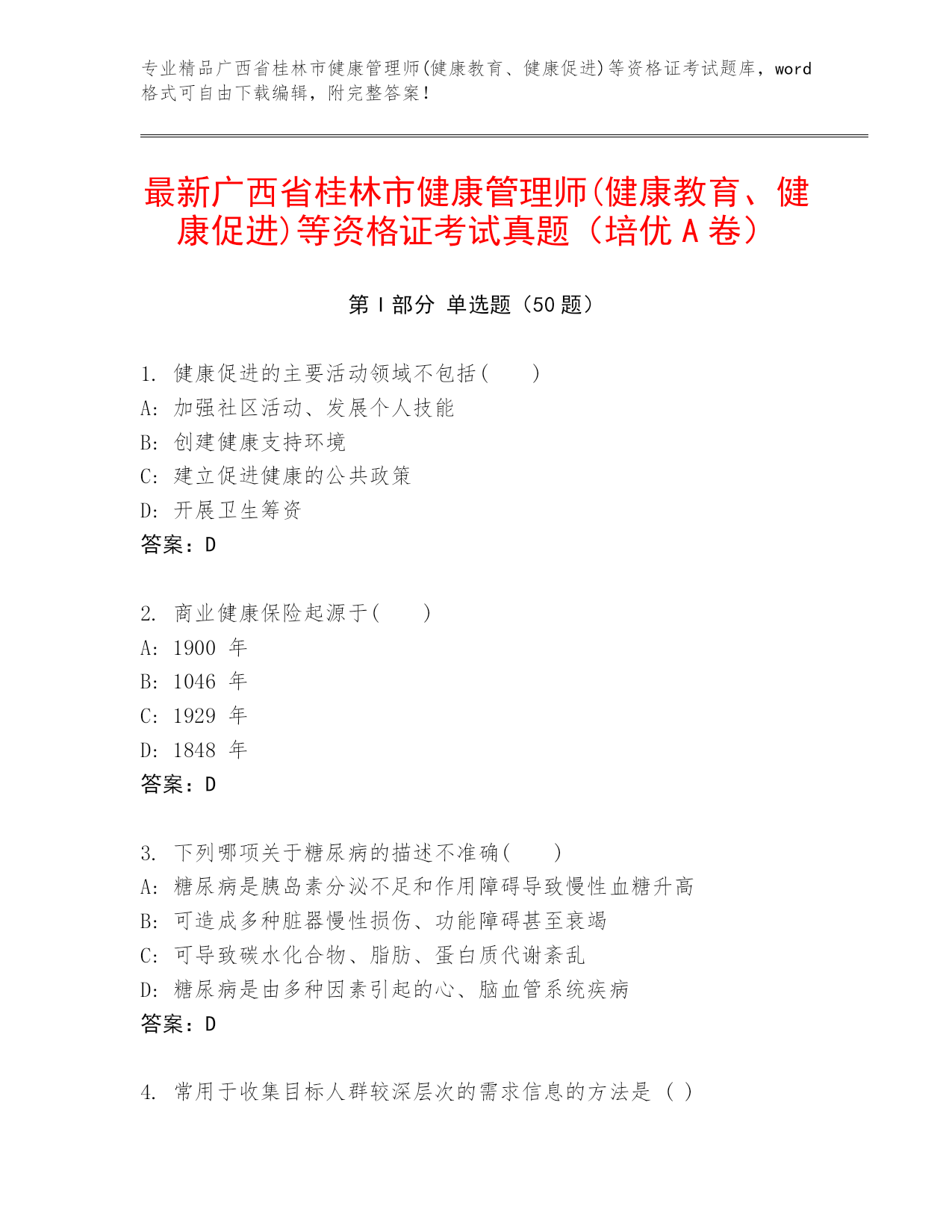 专业精品广西省桂林市健康管理师(健康教育、健康促进)等资格证考试题库,word格式可自由下载编辑,附完整答案!最新广西省桂林市健康管理师(健康教育、健康促进)等资格证考试真题(培优A卷)第I部分单选题(50题)1.健康促进的主要活动领域不包括()A:加强社区活动、发展个人技能B:创建健康支持环境C:建立促进健康的公共政策D:开展卫生筹资答案:D2.商业健康保险起源于()A:1900年B:1046年C:1929年D:1848年答案:D3.下列哪项关于糖尿病的描述不准确()A:糖尿病是胰岛素分泌不足和作用障碍