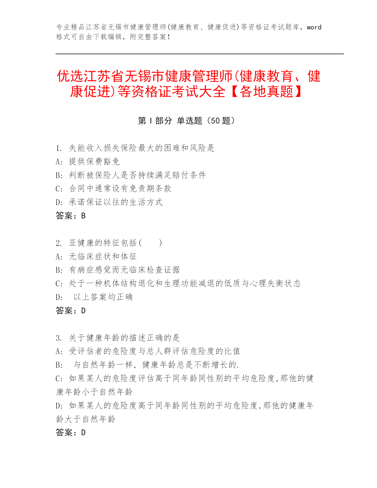 专业精品江苏省无锡市健康管理师(健康教育、健康促进)等资格证考试题库,word格式可自由下载编辑,附完整答案!优选江苏省无锡市健康管理师(健康教育、健康促进)等资格证考试大全【各地真题】第I部分单选题(50题)1.失能收入损失保险最大的困难和风险是A:提供保费豁免B:判断被保险人是否持续满足赔付条件C:合同中通常设有免责期条款D:承诺保证以往的生活方式答案:B2.亚健康的特征包括()A:无临床症状和体征B:有病症感觉而无临床检查证据C:处于一种机体结构退化和生理功能减退的低质与心理失衡状态D:以上答案均正