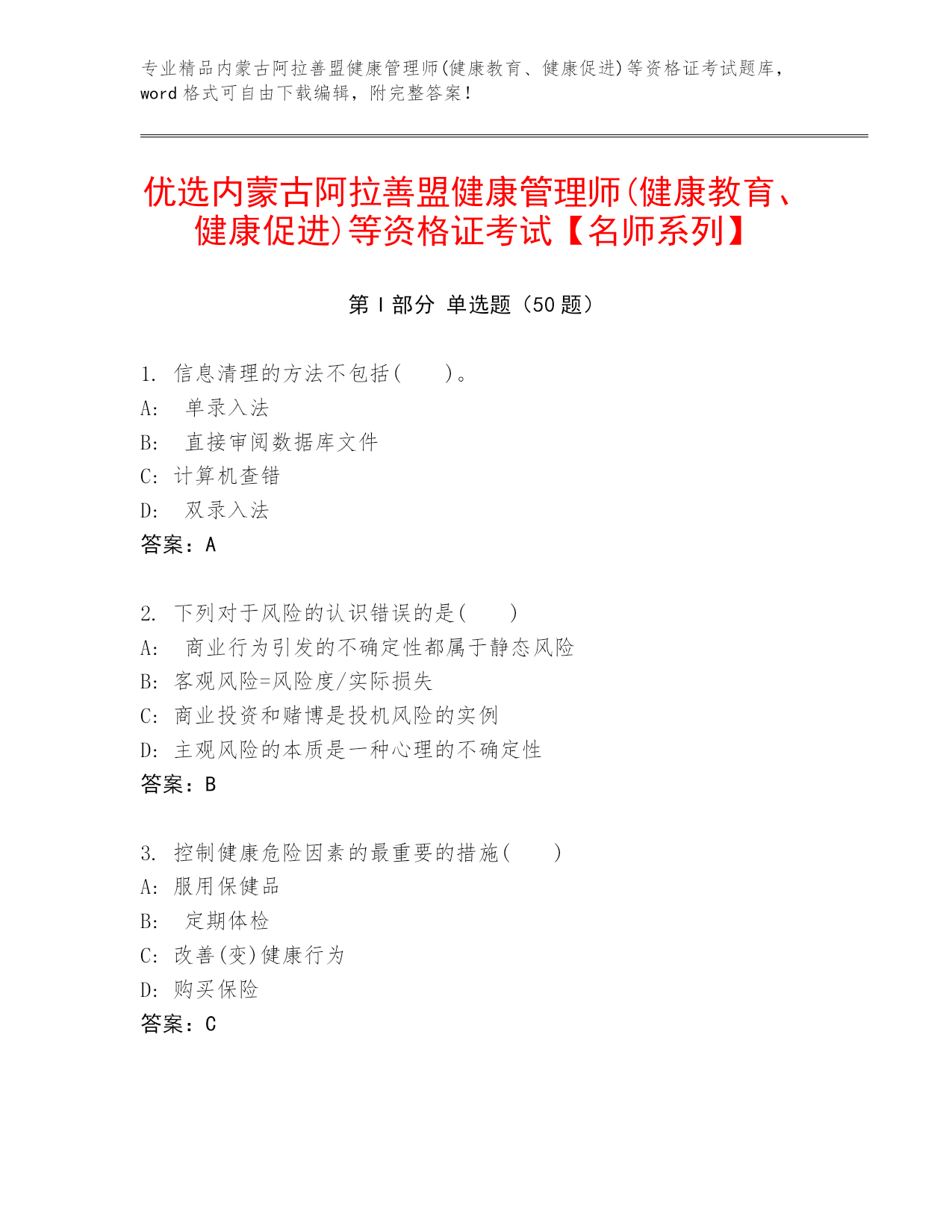 专业精品内蒙古阿拉善盟健康管理师(健康教育、健康促进)等资格证考试题库,word格式可自由下载编辑,附完整答案!优选内蒙古阿拉善盟健康管理师(健康教育、健康促进)等资格证考试【名师系列】第I部分单选题(50题)1.信息清理的方法不包括()。A:单录入法B:直接审阅数据库文件C:计算机查错D:双录入法答案:A2.下列对于风险的认识错误的是()A:商业行为引发的不确定性都属于静态风险B:客观风险=风险度/实际损失C:商业投资和赌博是投机风险的实例D:主观风险的本质是一种心理的不确定性答案:B3.控制健康危险因