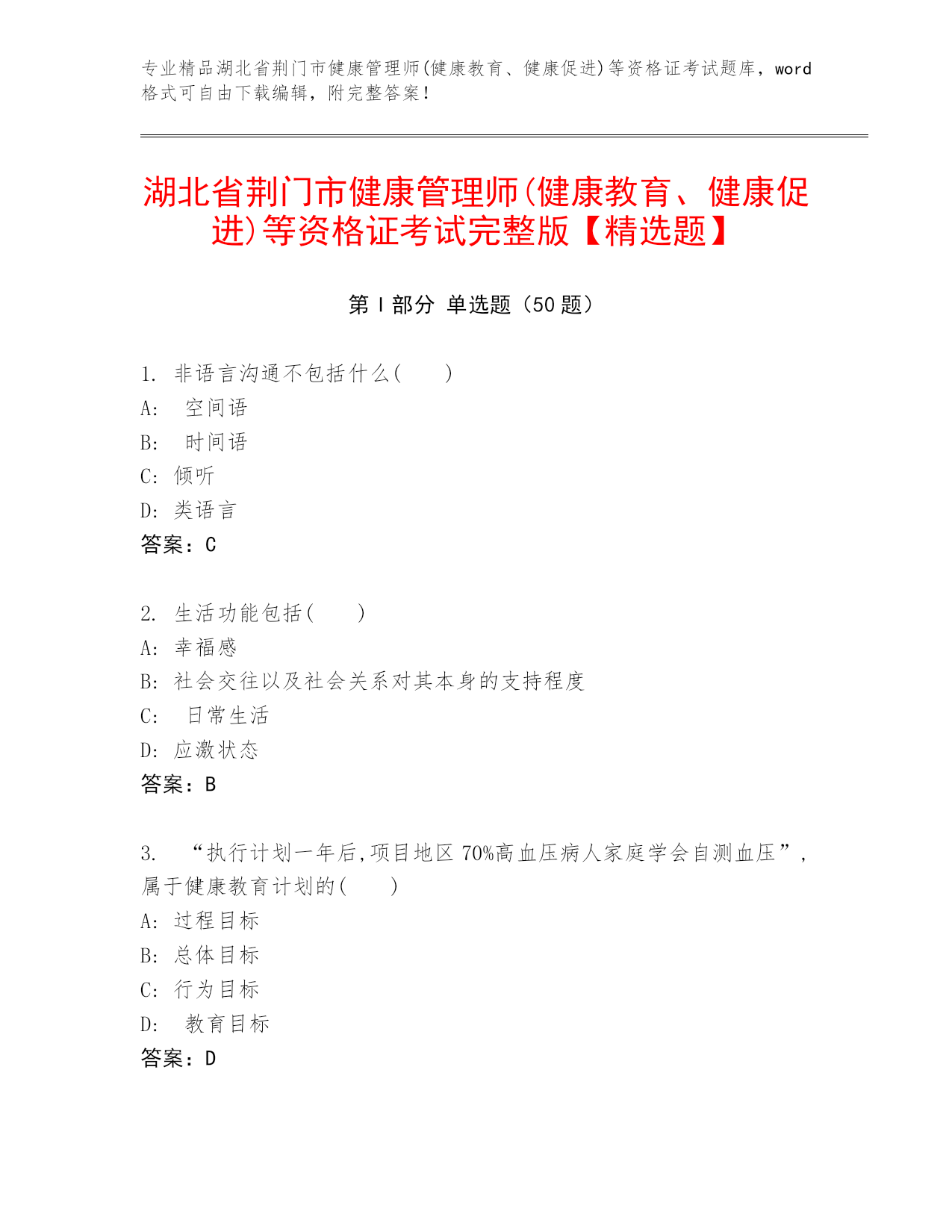 湖北省荆门市健康管理师(健康教育、健康促进)等资格证考试完整版【精选题】.docx