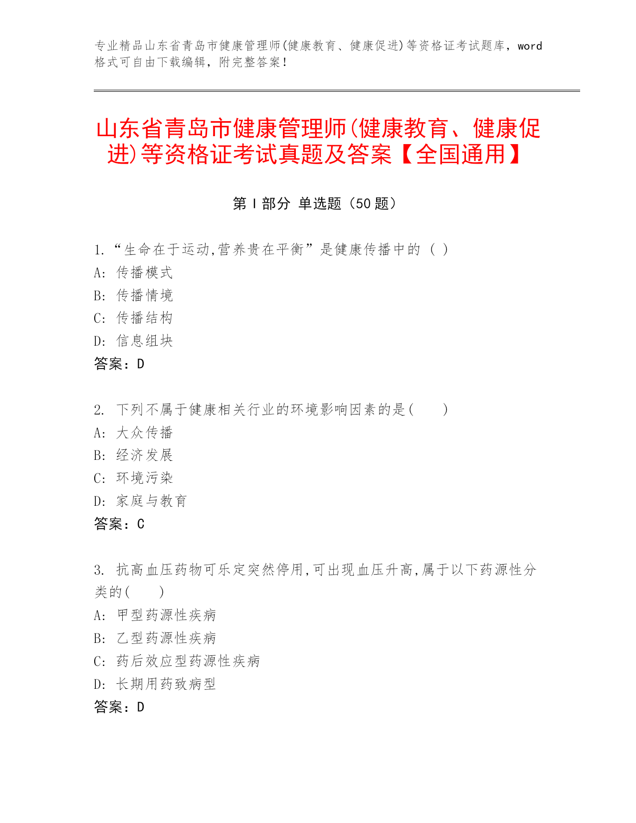 山东省青岛市健康管理师(健康教育、健康促进)等资格证考试真题及答案【全国通用】.docx