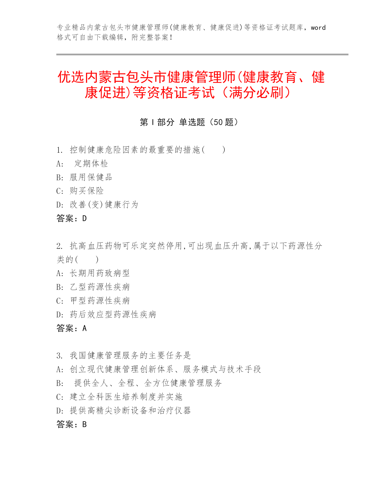 优选内蒙古包头市健康管理师(健康教育、健康促进)等资格证考试(满分必刷).docx