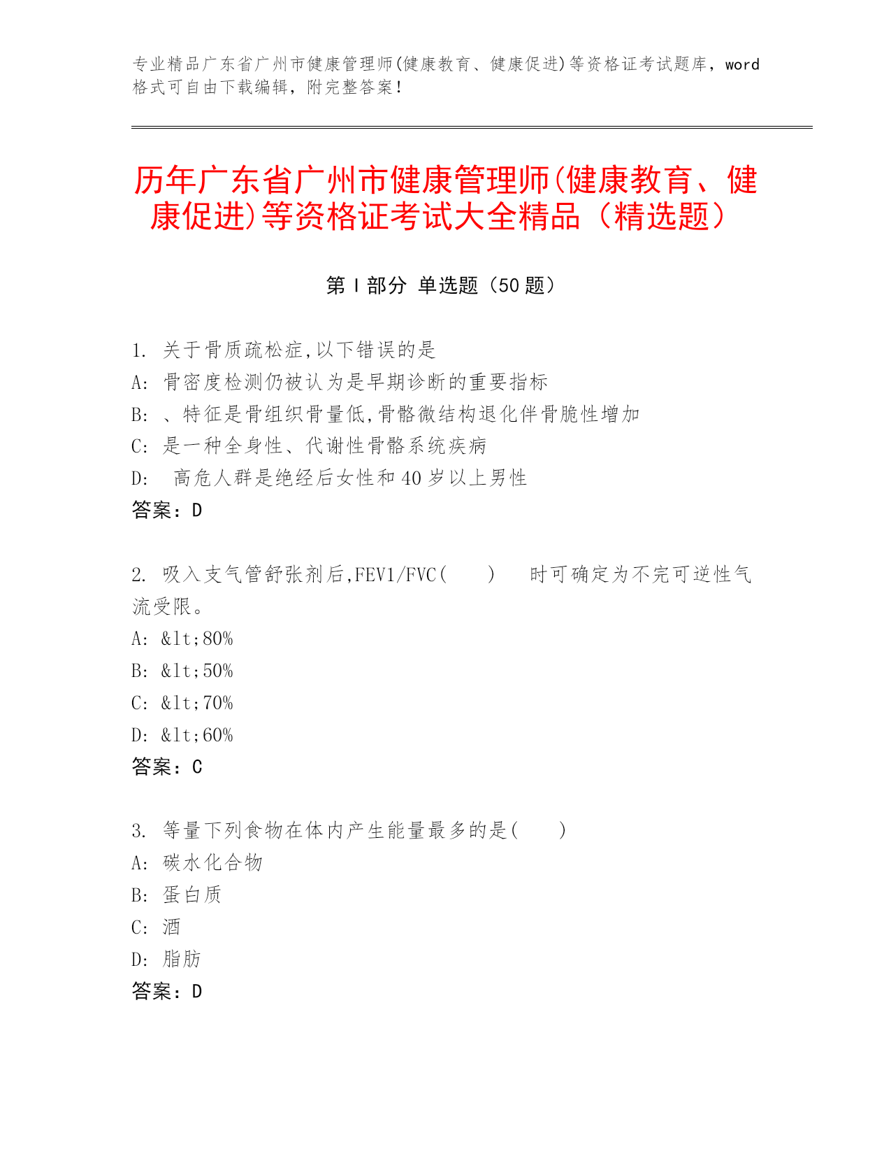 历年广东省广州市健康管理师(健康教育、健康促进)等资格证考试大全精品(精选题).docx