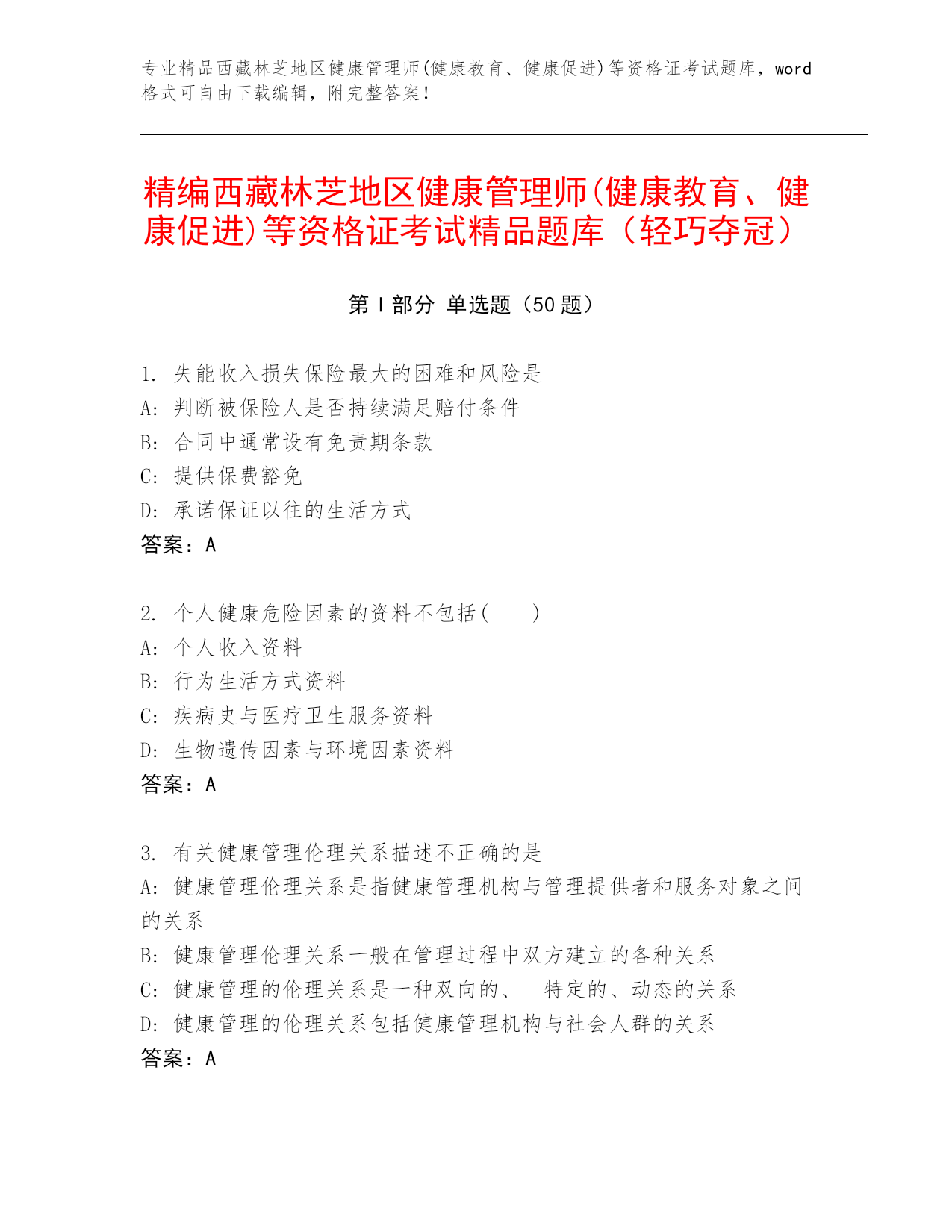 精编西藏林芝地区健康管理师(健康教育、健康促进)等资格证考试精品题库(轻巧夺冠).docx