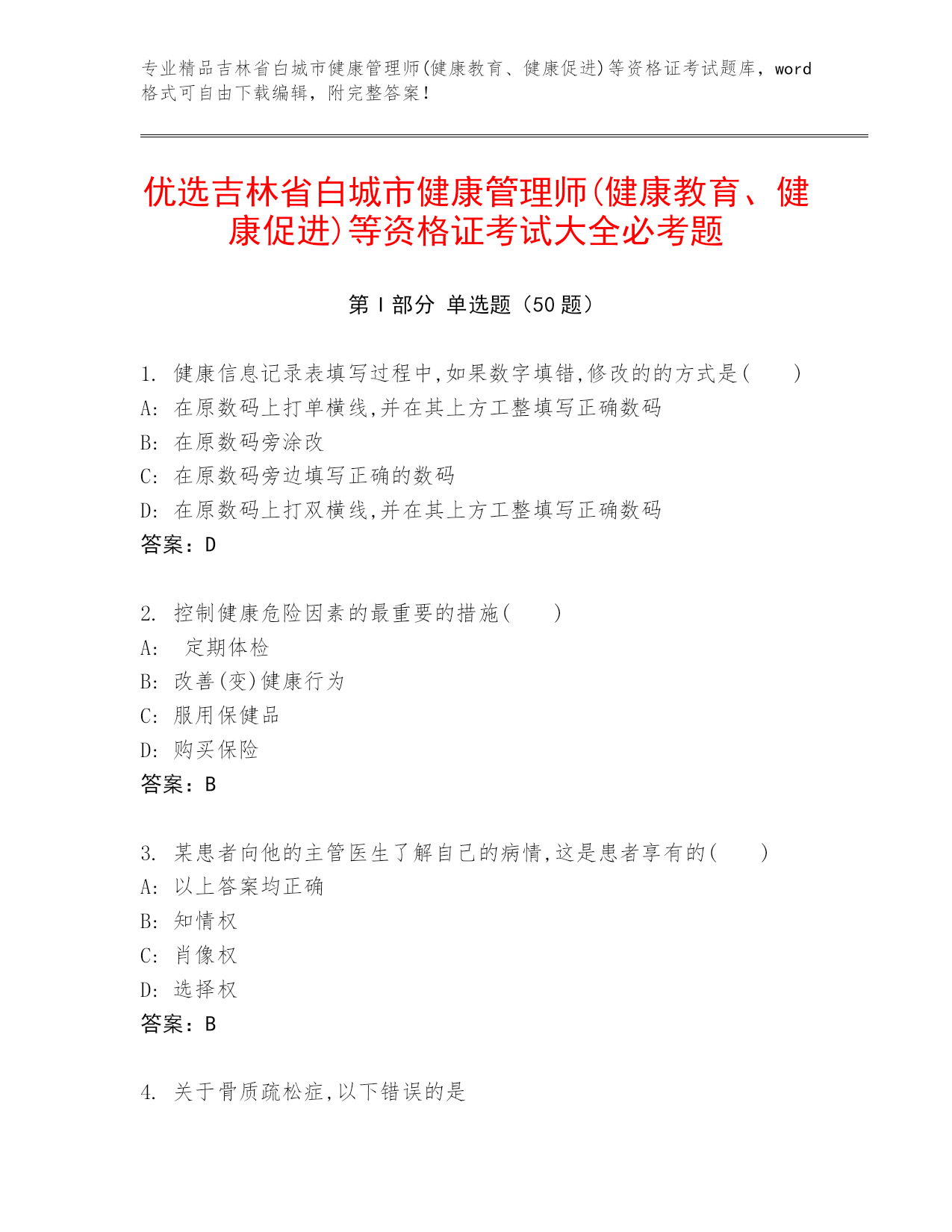 优选吉林省白城市健康管理师(健康教育、健康促进)等资格证考试大全必考题.docx