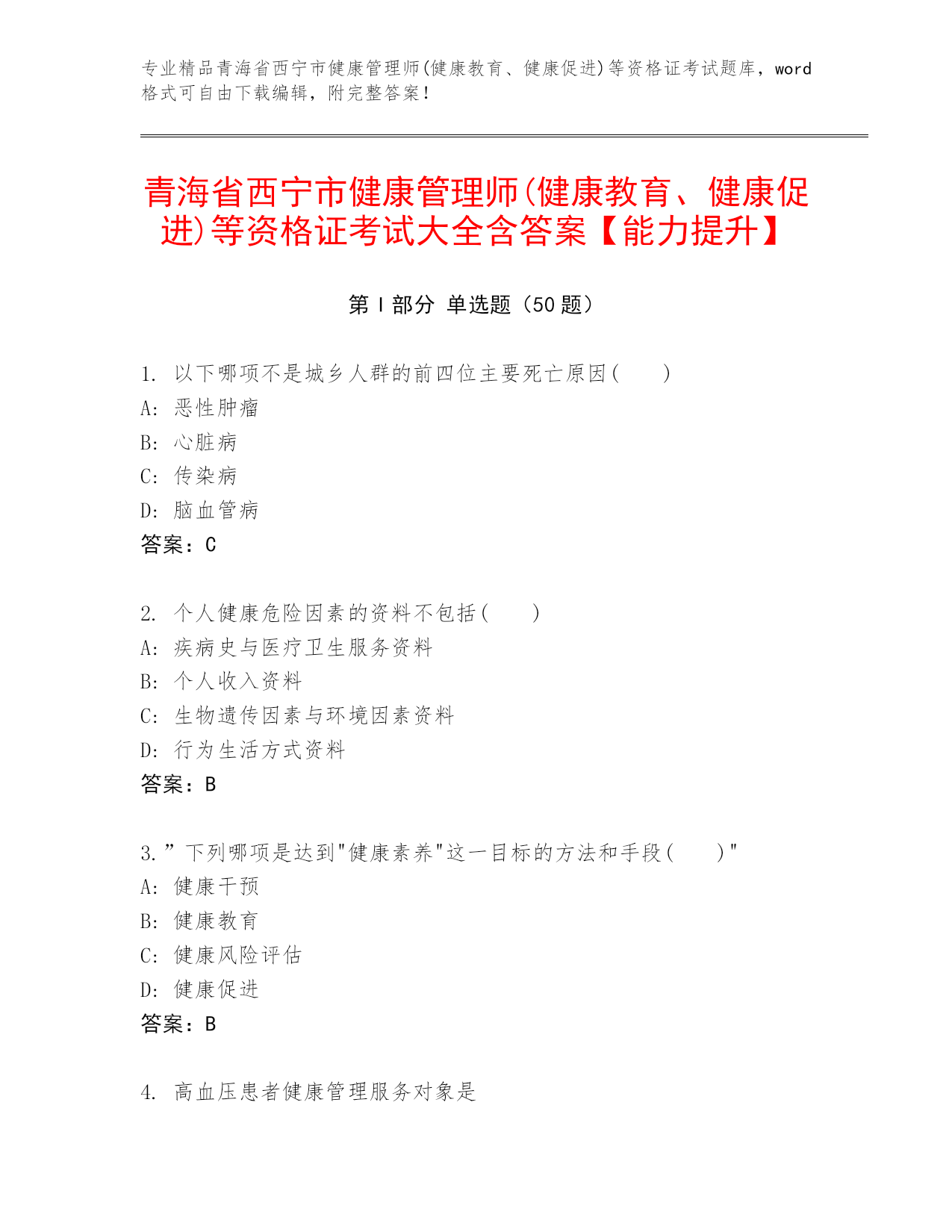 青海省西宁市健康管理师(健康教育、健康促进)等资格证考试大全含答案【能力提升】.docx