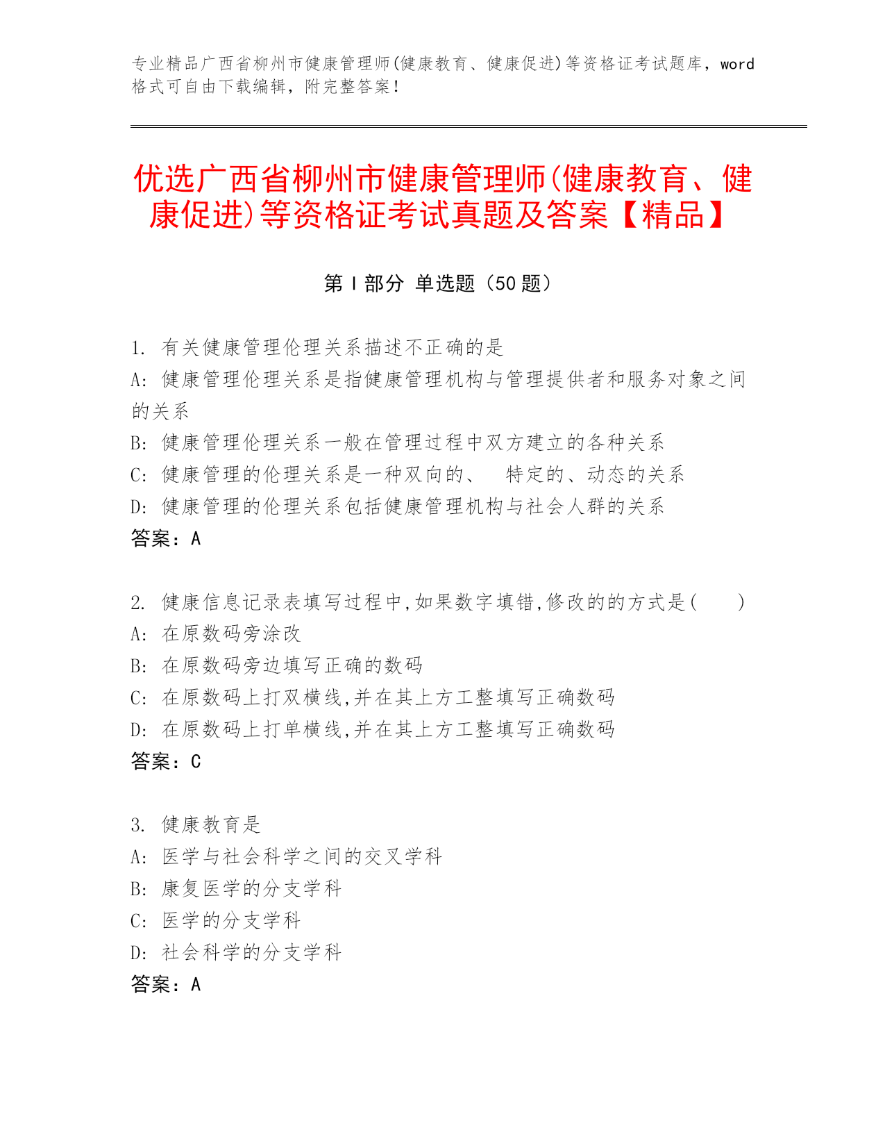 优选广西省柳州市健康管理师(健康教育、健康促进)等资格证考试真题及答案【精品】.docx