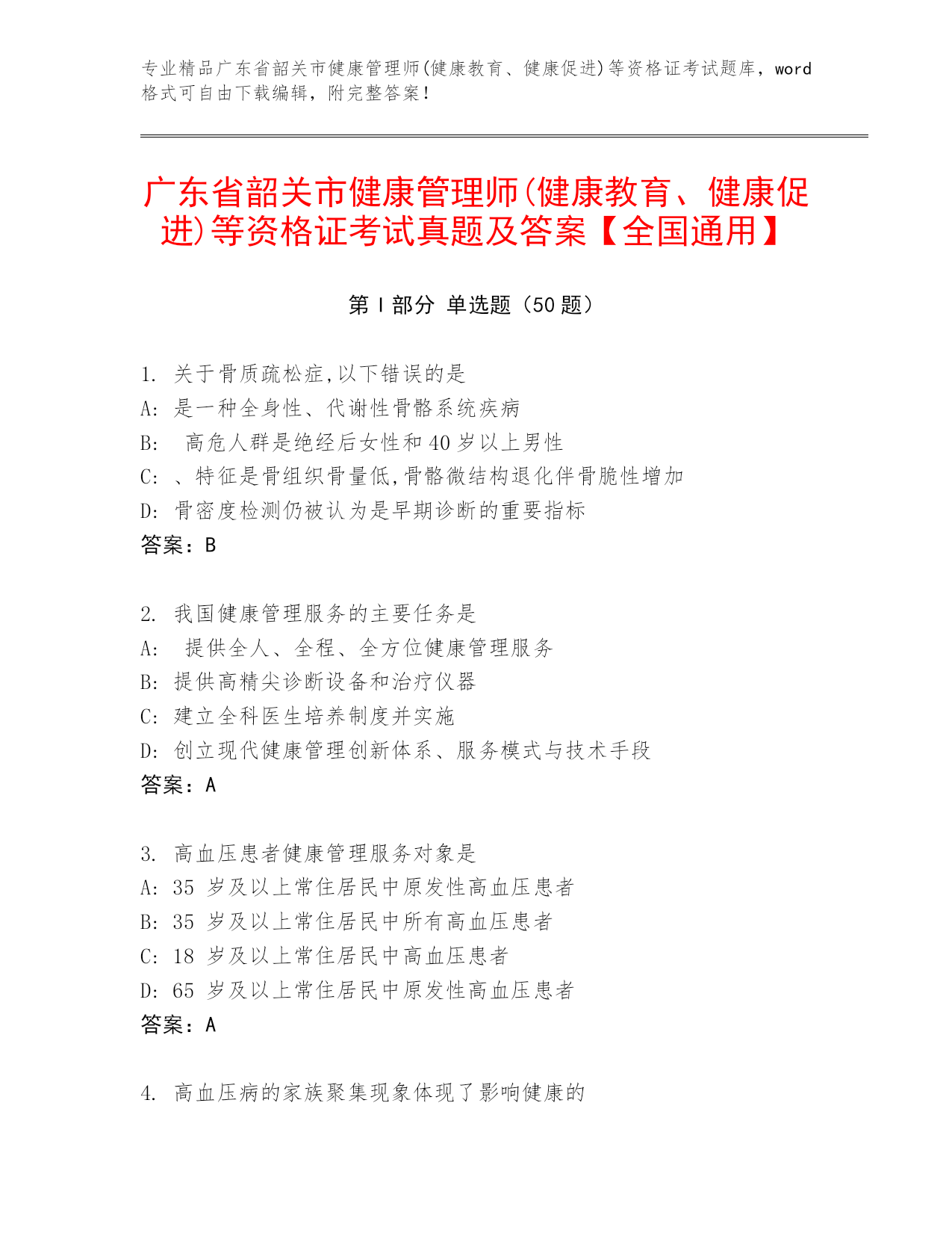专业精品广东省韶关市健康管理师(健康教育、健康促进)等资格证考试题库,word格式可自由下载编辑,附完整答案!广东省韶关市健康管理师(健康教育、健康促进)等资格证考试真题及答案【全国通用】第I部分单选题(50题)1.关于骨质疏松症,以下错误的是A:是一种全身性、代谢性骨骼系统疾病B:高危人群是绝经后女性和40岁以上男性C:、特征是骨组织骨量低,骨骼微结构退化伴骨脆性增加D:骨密度检测仍被认为是早期诊断的重要指标答案:B2.我国健康管理服务的主要任务是A:提供全人、全程、全方位健康管理服务B:提供高精尖诊断