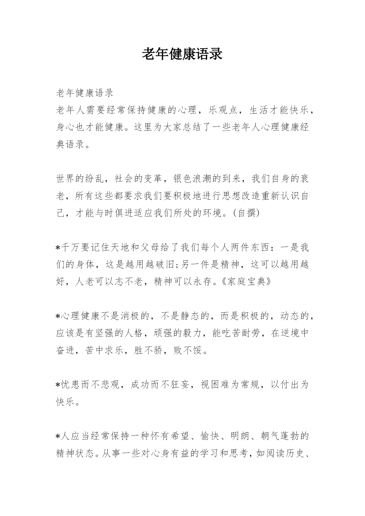 老年健康语录老年健康语录老年人需要经常保持健康的心理,乐观点,生活才能快乐,身心也才能健康。这里为大家总结了一些老年人心理健康经典语录。世界的纷乱,社会的变革,银色浪潮的到来,我们自身的衰老,所有这些都要求我们要积极地进行思想改造重新认识自己,才能与时俱进适应我们所处的环境。(自撰)*千万要记住天地和父母给了我们每个人两件东西:一是我们的身体,这是越用越破旧;另一件是精神,这可以越用越好,人老可以志不老,精神可以永存。《家庭宝典》*心理健康不是消极的,不是静态的,而是积极的,动态的,应该是有坚强的人格,顽
