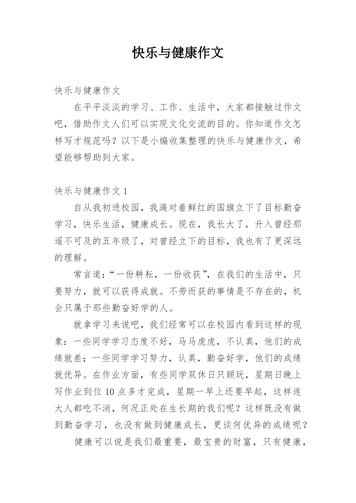 快乐与健康作文快乐与健康作文在平平淡淡的学习、工作、生活中,大家都接触过作文吧,借助作文人们可以实现文化交流的目的。你知道作文怎样写才规范吗?以下是小编收集整理的快乐与健康作文,希望能够帮助到大家。快乐与健康作文1自从我初进校园,我遍对着鲜红的国旗立下了目标勤奋学习,快乐生活,健康成长。现在,我长大了,升入曾经那遥不可及的五年级了,对曾经立下的目标,我也有了更深远的理解。常言道:“一份耕耘,一份收获”,在我们的生活中,只要努力,就可以获得成就。不劳而获的事情是不存在的,机会只属于那些勤奋好学的人。就拿学习
