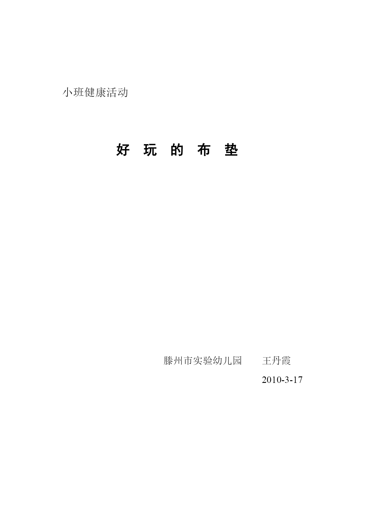 小班健康活动好玩的布垫滕州市实验幼儿园王丹霞2010-3-17小班健康活动好玩的布垫活动目标:尝试用垫子玩各种游戏。能肢体协调地做动作。活动准备:各种颜色鲜艳的、大小不同的布垫若干。(多于幼儿人数)“小猫”、“小鸭”的房子各一个,小猴毛绒玩具一个。置衣筐、擦汗毛巾或纸巾等、小鼓一个。活动过程:活动前热身用布垫开汽车入场玩藏猫猫游戏(用布垫藏住脸、屁股、膝盖等)。引导幼儿探索垫子的玩法你们想一想小布垫还可以怎样玩?(幼儿自由探索)变成小乌龟爬做小猴划船游戏创设情境:去小猴家做客,怎么过河?坐船练习自由划船听