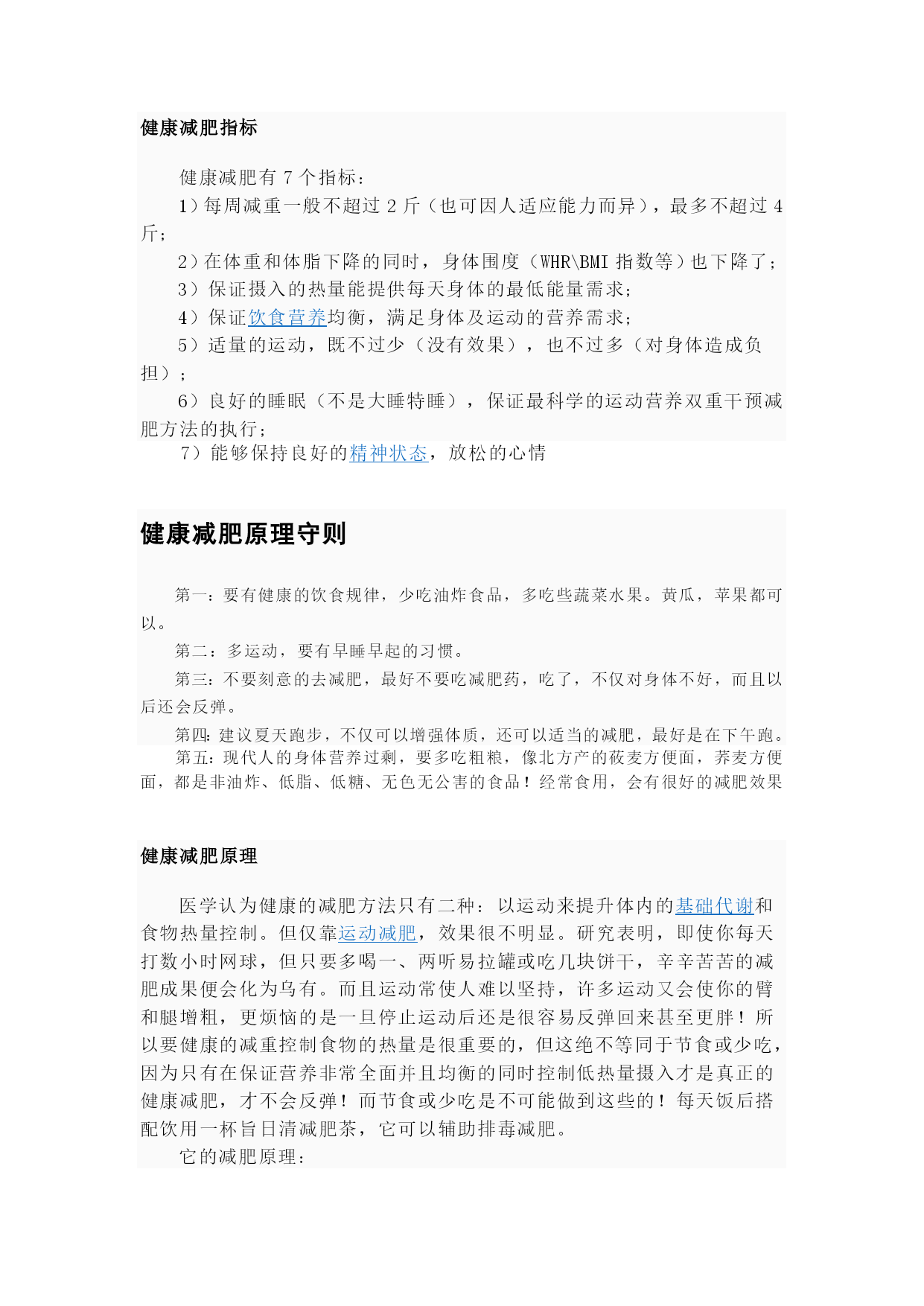 健康减肥指标健康减肥有7个指标:1)每周减重一般不超过2斤(也可因人适应能力而异),最多不超过4斤;2)在体重和体脂下降的同时,身体围度(WHR\BMI指数等)也下降了;3)保证摄入的热量能提供每天身体的最低能量需求;4)保证HYPERLINK"http://baike.baidu.com/view/1661864.htm"\t"_blank"饮食营养均衡,满足身体及运动的营养需求;5)适量的运动,既不过少(没有效果),也不过多(对身体造成负担);6)良好的睡眠(不是大睡特睡),保证最科学的运动营养