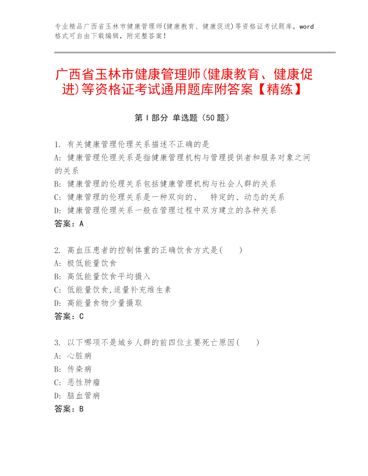 广西省玉林市健康管理师(健康教育、健康促进)等资格证考试通用题库附答案【精练】.docx