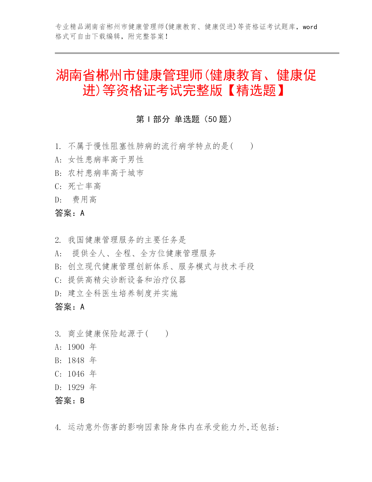 湖南省郴州市健康管理师(健康教育、健康促进)等资格证考试完整版【精选题】.docx