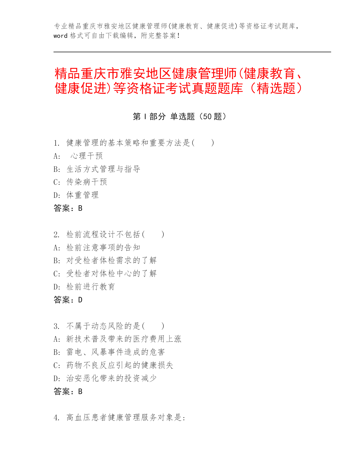 精品重庆市雅安地区健康管理师(健康教育、健康促进)等资格证考试真题题库(精选题).docx