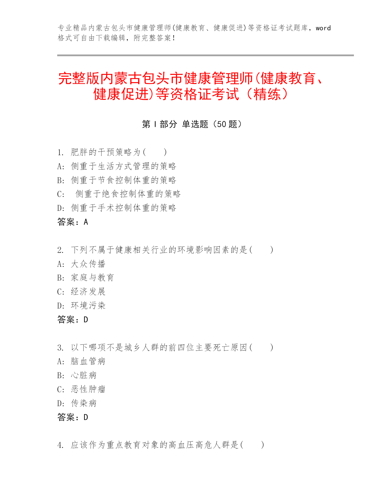 专业精品内蒙古包头市健康管理师(健康教育、健康促进)等资格证考试题库,word格式可自由下载编辑,附完整答案!完整版内蒙古包头市健康管理师(健康教育、健康促进)等资格证考试(精练)第I部分单选题(50题)1.肥胖的干预策略为()A:侧重于生活方式管理的策略B:侧重于节食控制体重的策略C:侧重于绝食控制体重的策略D:侧重于手术控制体重的策略答案:A2.下列不属于健康相关行业的环境影响因素的是()A:大众传播B:家庭与教育C:经济发展D:环境污染答案:D3.以下哪项不是城乡人群的前四位主要死亡原因()A:脑血