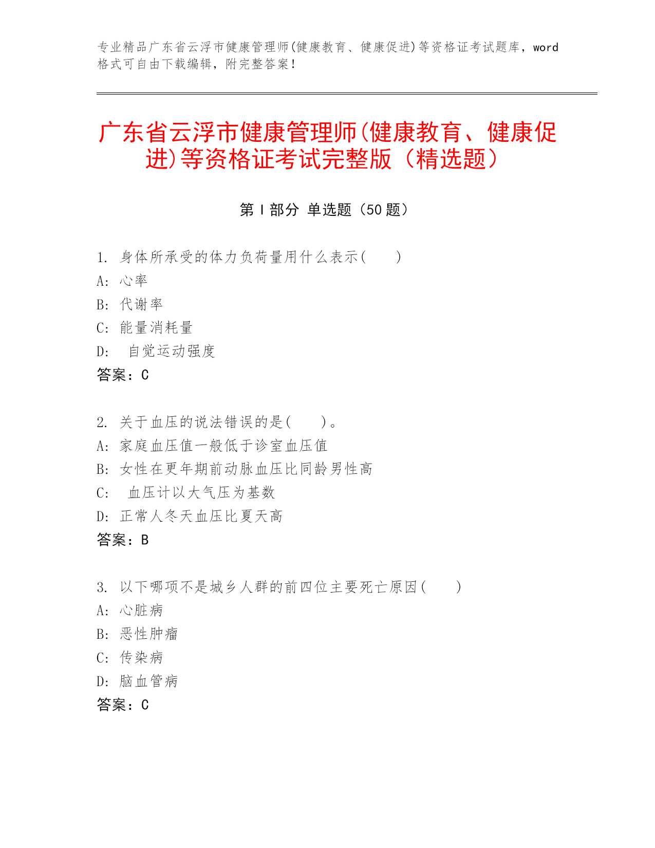 广东省云浮市健康管理师(健康教育、健康促进)等资格证考试完整版(精选题).docx