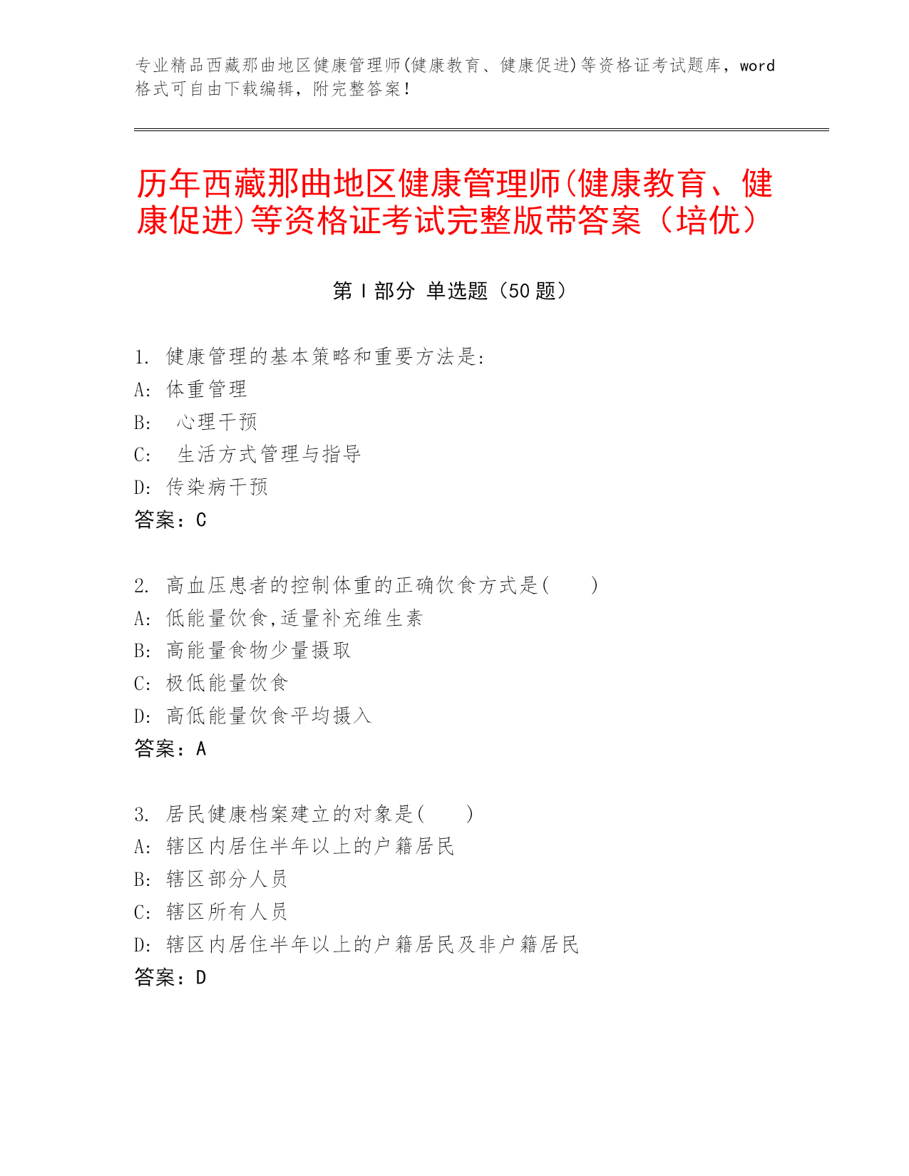 历年西藏那曲地区健康管理师(健康教育、健康促进)等资格证考试完整版带答案(培优).docx