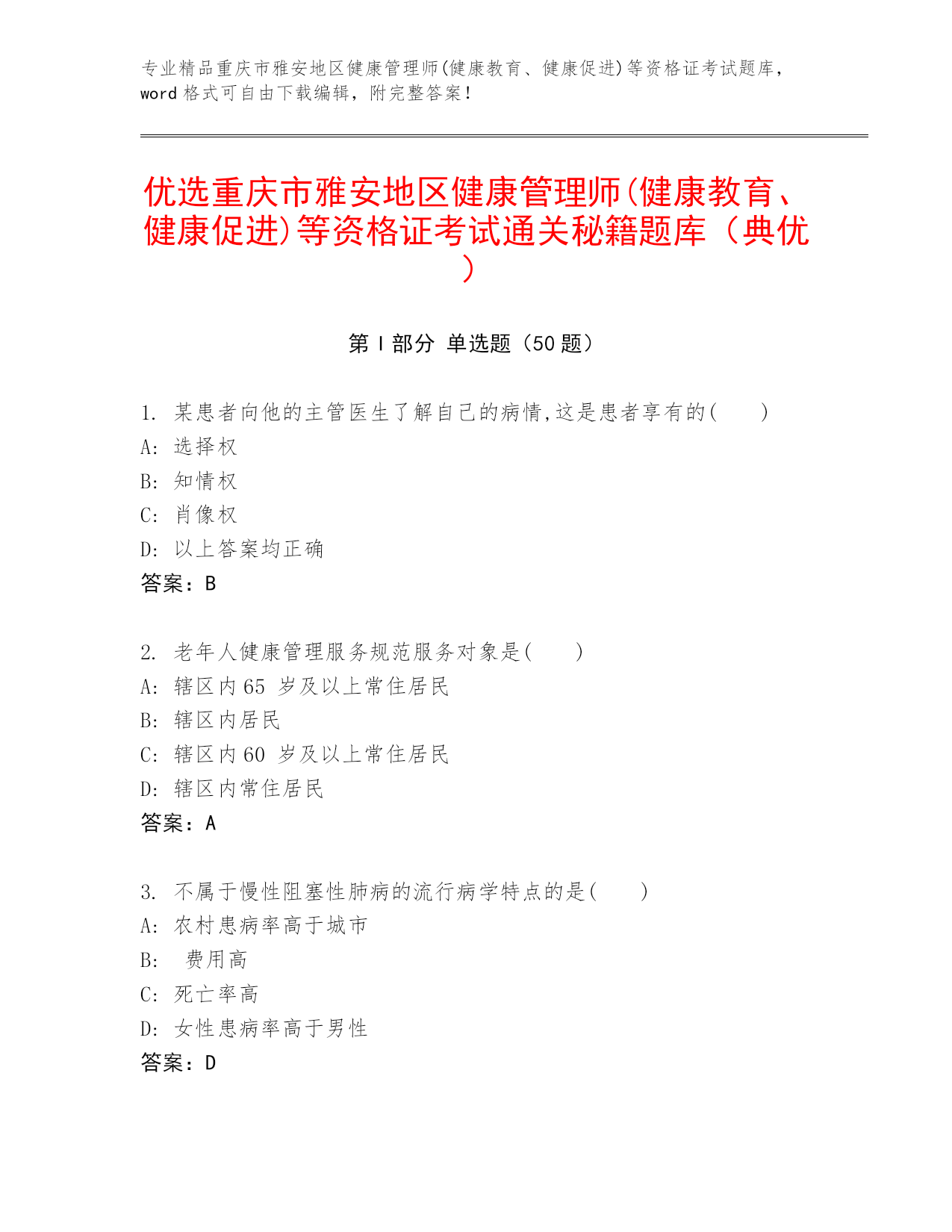 优选重庆市雅安地区健康管理师(健康教育、健康促进)等资格证考试通关秘籍题库(典优).docx