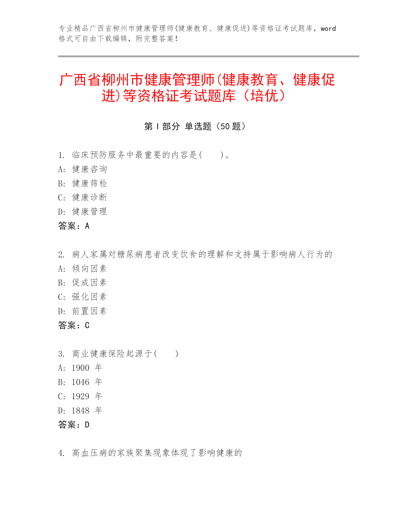 广西省柳州市健康管理师(健康教育、健康促进)等资格证考试题库(培优).docx