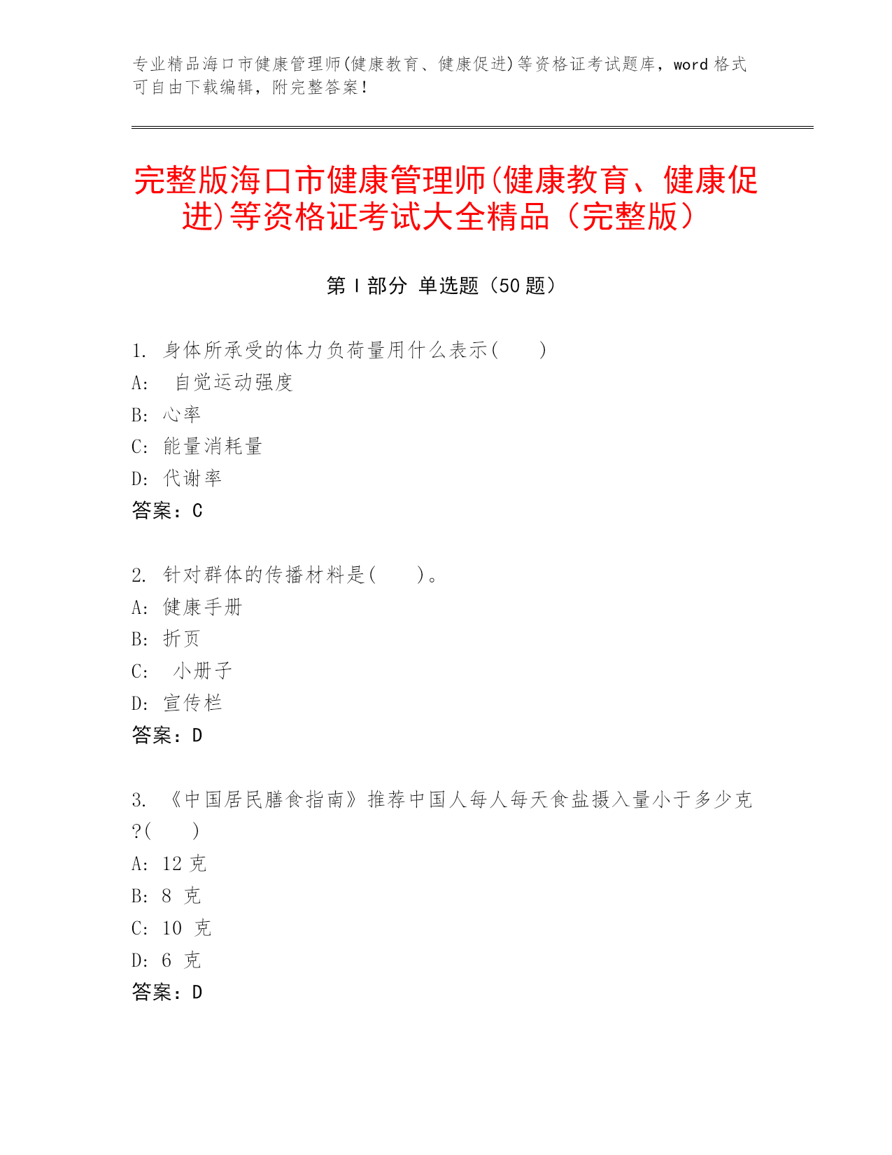 完整版海口市健康管理师(健康教育、健康促进)等资格证考试大全精品(完整版).docx