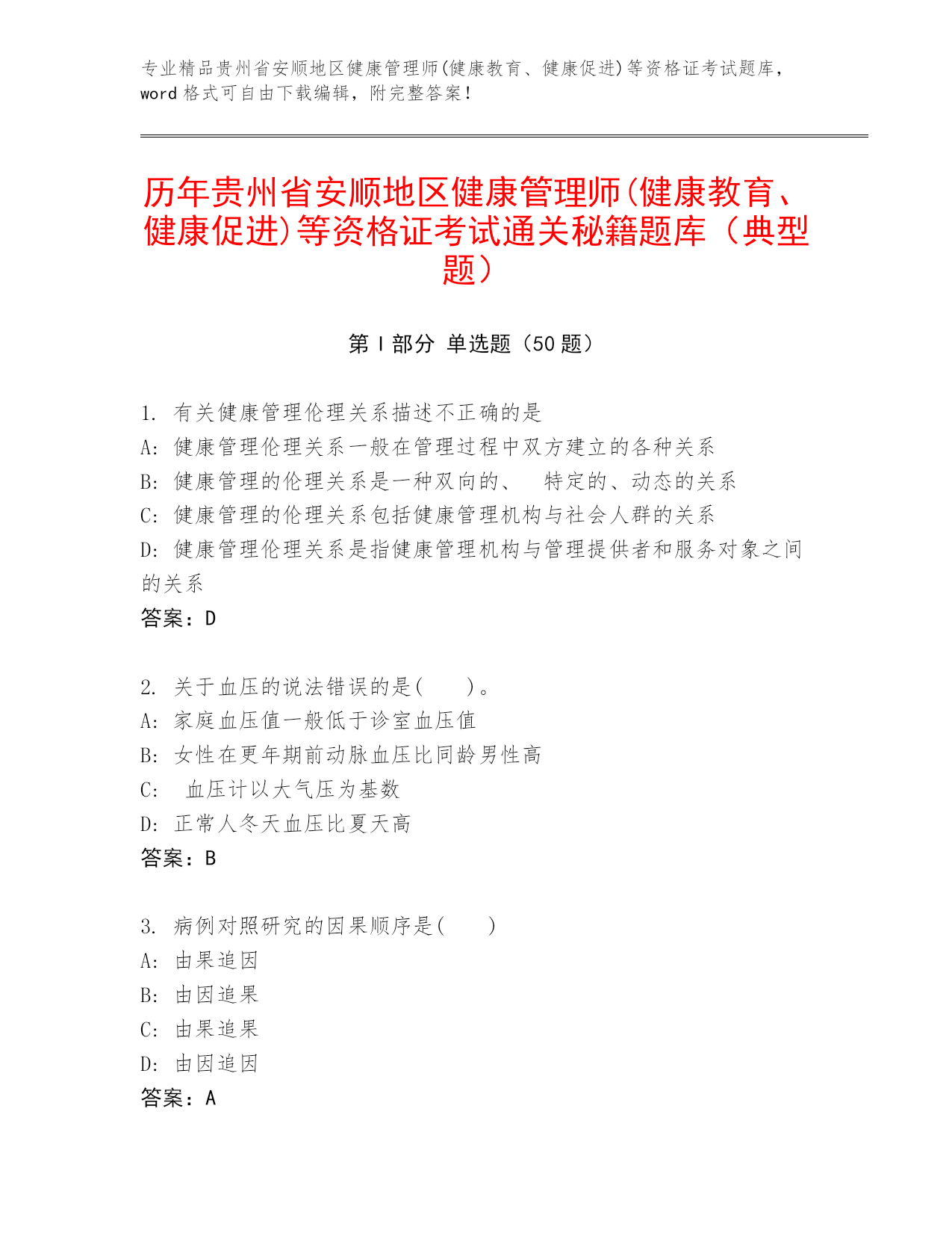 历年贵州省安顺地区健康管理师(健康教育、健康促进)等资格证考试通关秘籍题库(典型题).docx