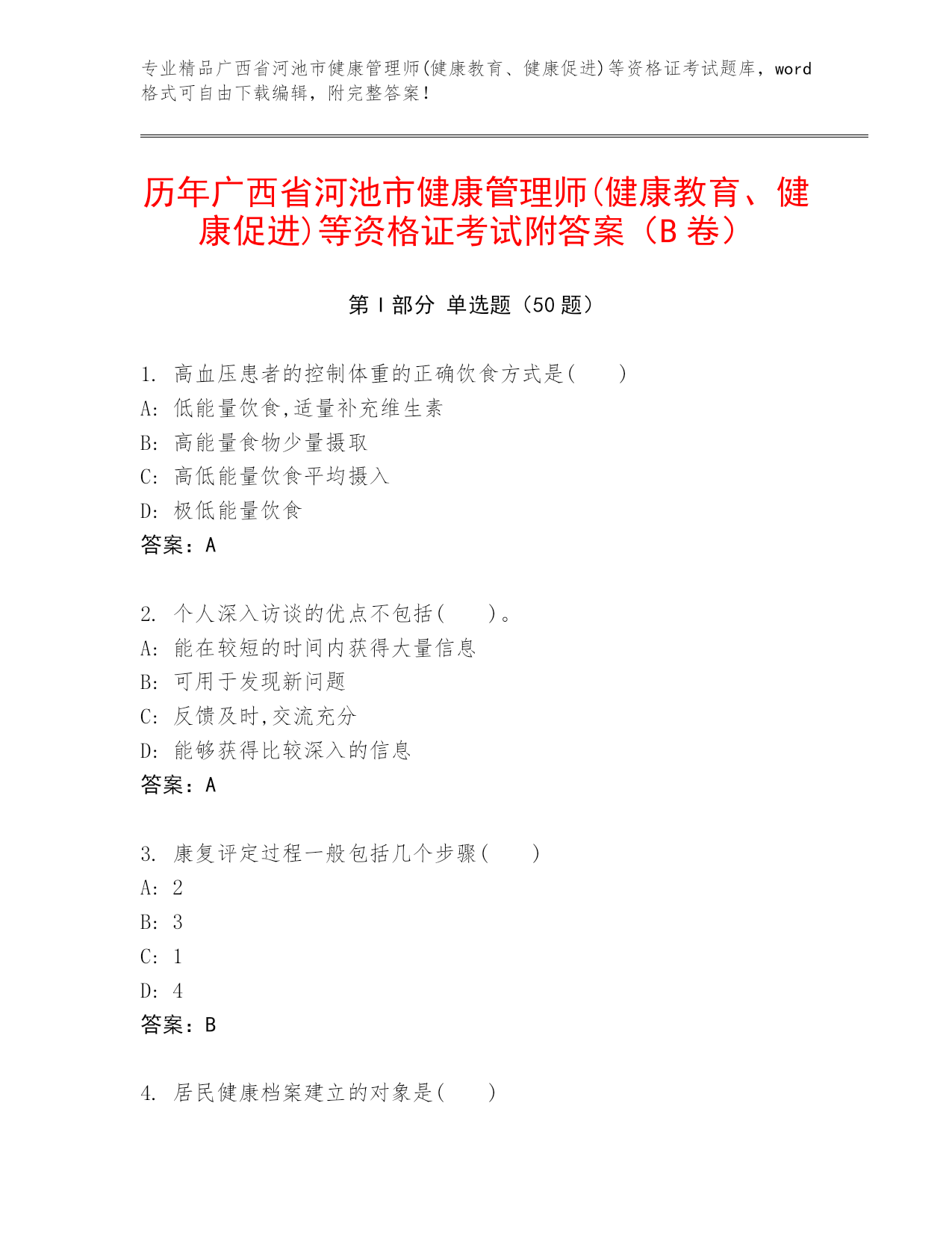 历年广西省河池市健康管理师(健康教育、健康促进)等资格证考试附答案(B卷).docx