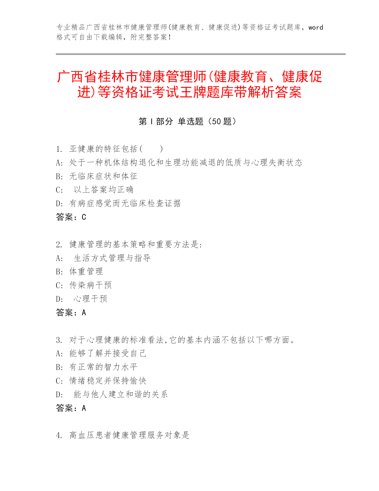 广西省桂林市健康管理师(健康教育、健康促进)等资格证考试王牌题库带解析答案.docx