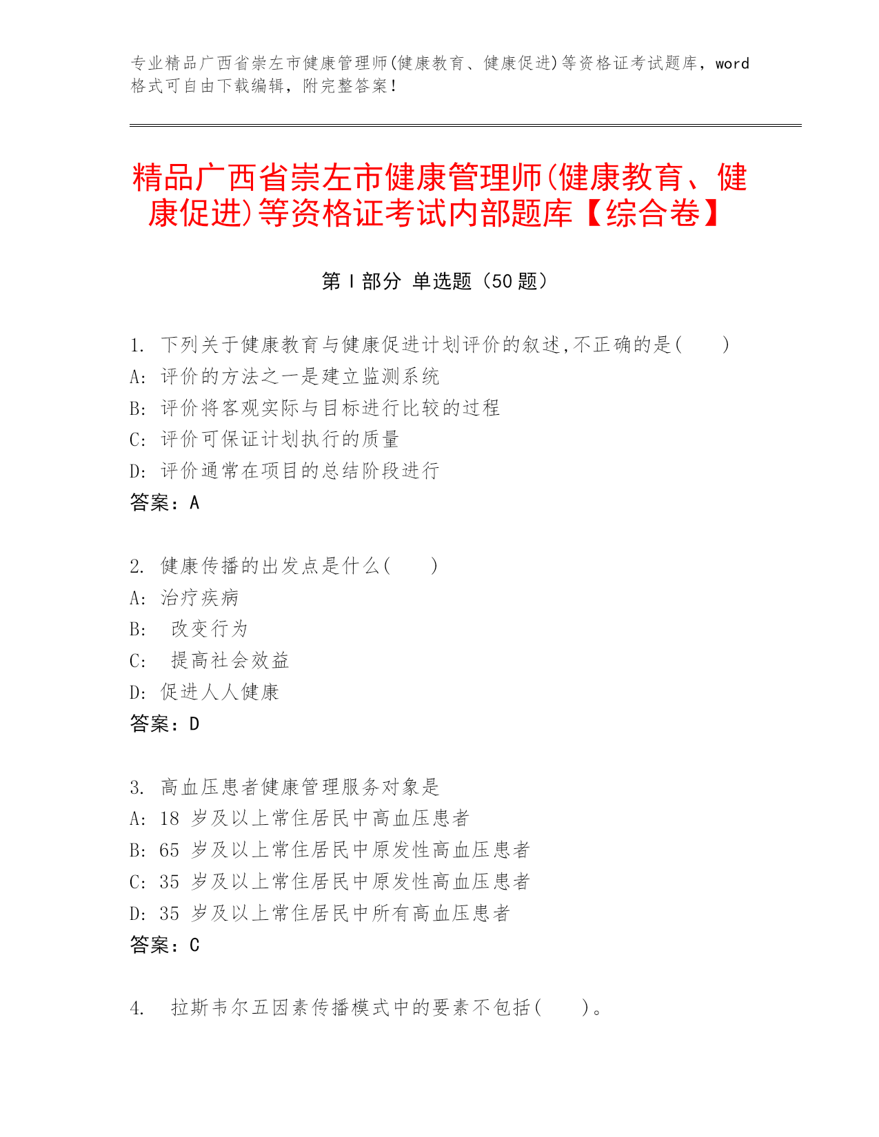精品广西省崇左市健康管理师(健康教育、健康促进)等资格证考试内部题库【综合卷】.docx