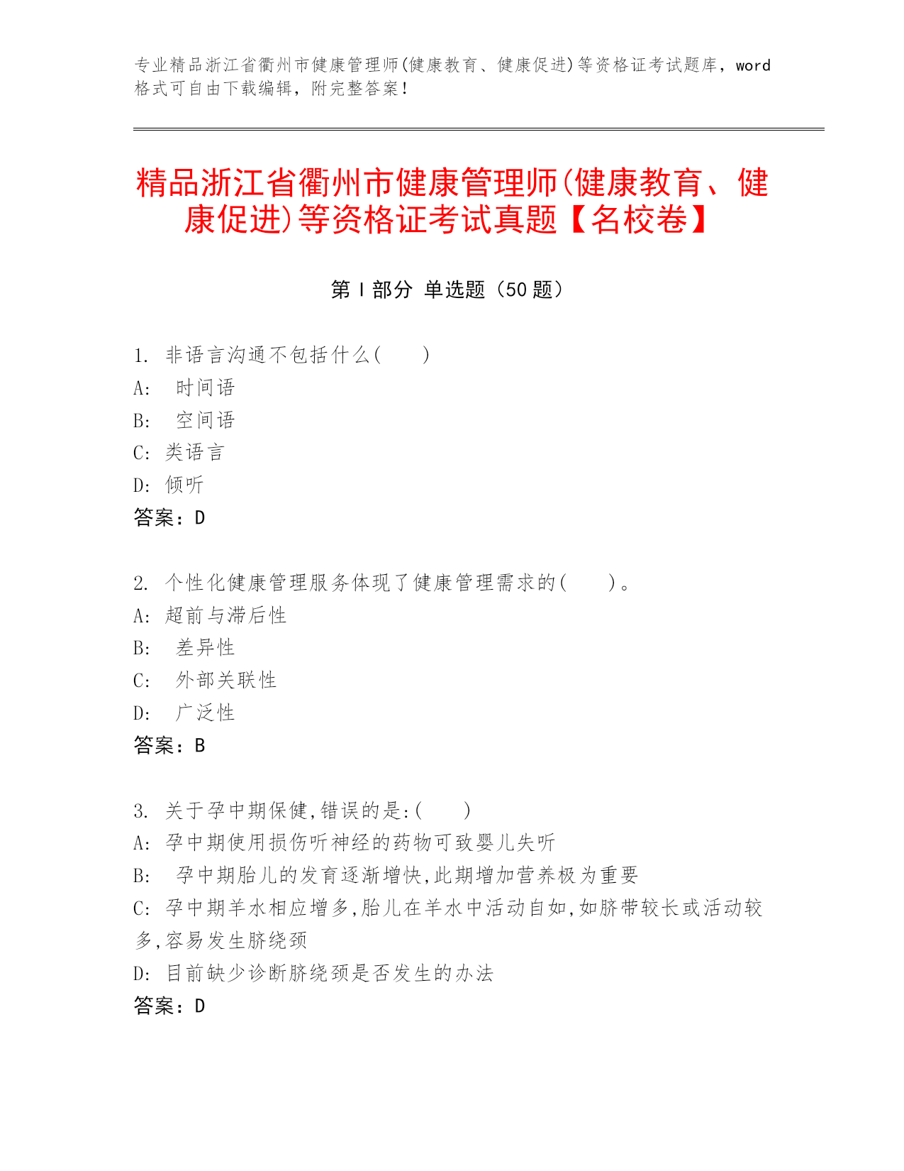 专业精品浙江省衢州市健康管理师(健康教育、健康促进)等资格证考试题库,word格式可自由下载编辑,附完整答案!精品浙江省衢州市健康管理师(健康教育、健康促进)等资格证考试真题【名校卷】第I部分单选题(50题)1.非语言沟通不包括什么()A:时间语B:空间语C:类语言D:倾听答案:D2.个性化健康管理服务体现了健康管理需求的()。A:超前与滞后性B:差异性C:外部关联性D:广泛性答案:B3.关于孕中期保健,错误的是:()A:孕中期使用损伤听神经的药物可致婴儿失听B:孕中期胎儿的发育逐渐增快,此期增加营养极为