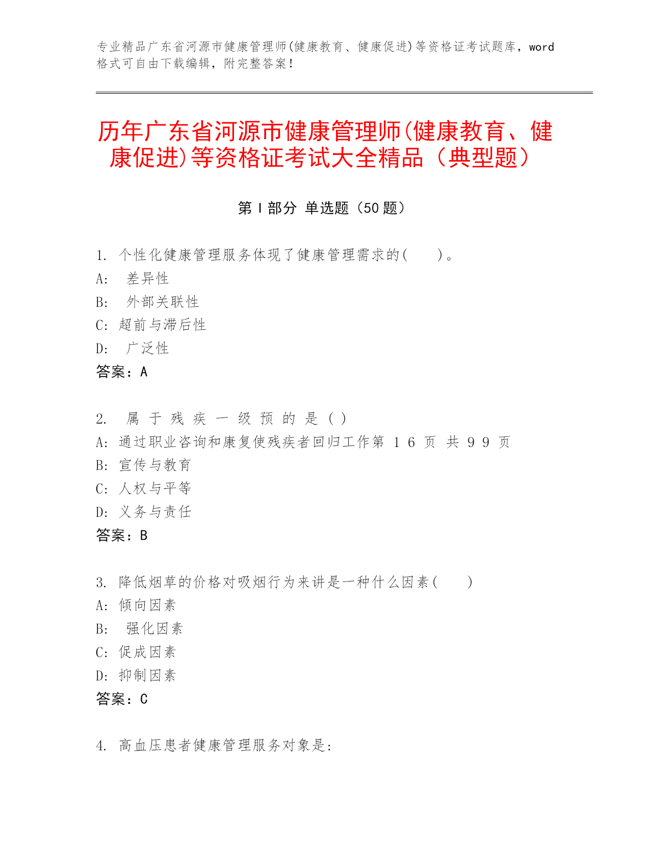 专业精品广东省河源市健康管理师(健康教育、健康促进)等资格证考试题库,word格式可自由下载编辑,附完整答案!历年广东省河源市健康管理师(健康教育、健康促进)等资格证考试大全精品(典型题)第I部分单选题(50题)1.个性化健康管理服务体现了健康管理需求的()。A:差异性B:外部关联性C:超前与滞后性D:广泛性答案:A2.属于残疾一级预的是()A:通过职业咨询和康复使残疾者回归工作B:宣传与教育C:人权与平等D:义务与责任答案:B3.降低烟草的价格对吸烟行为来讲是一种什么因素()A:倾向因素B:强化因素C: