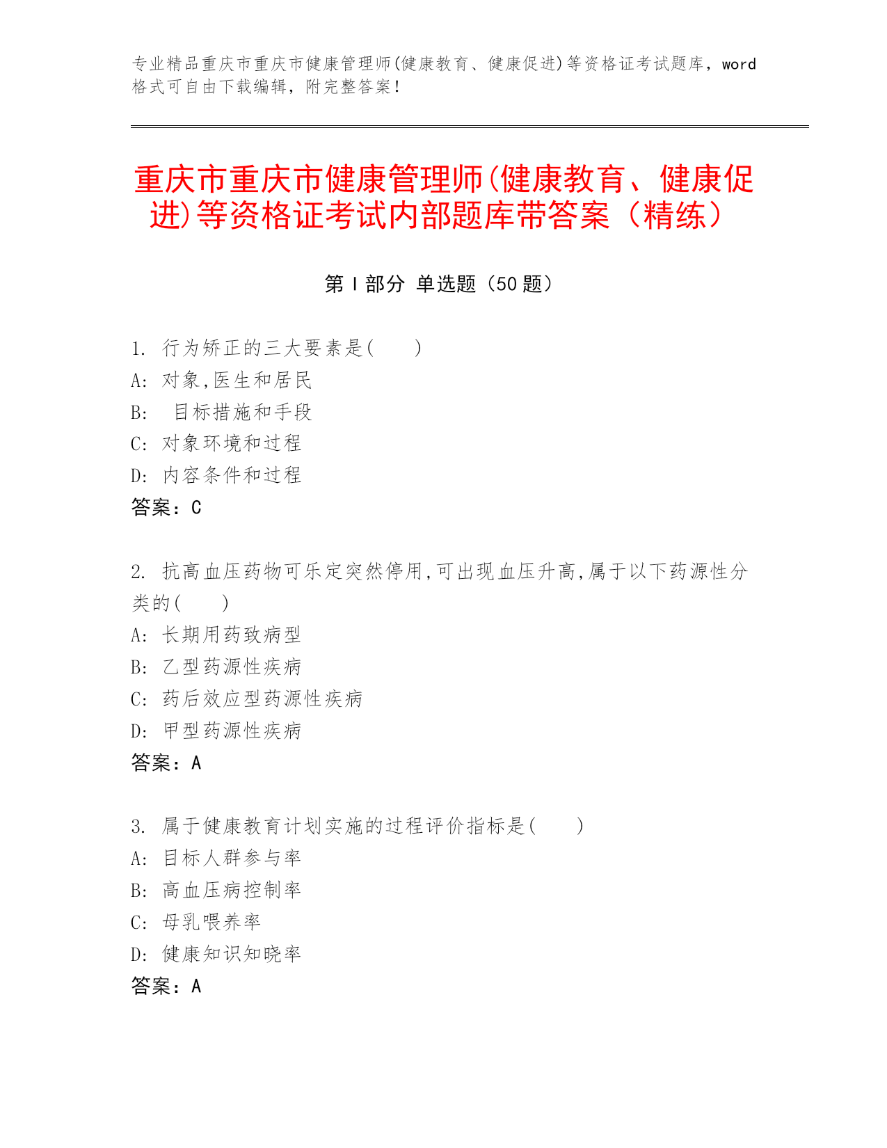 重庆市重庆市健康管理师(健康教育、健康促进)等资格证考试内部题库带答案(精练).docx