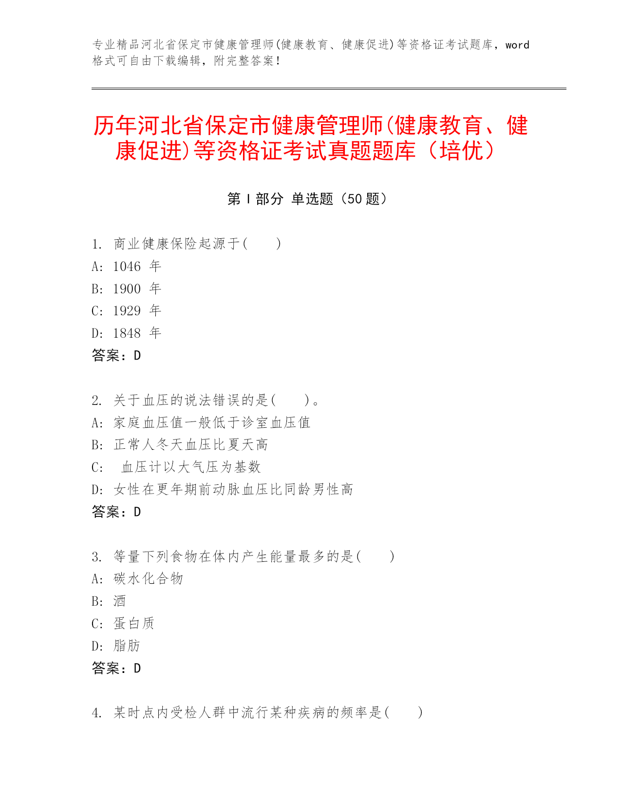 专业精品河北省保定市健康管理师(健康教育、健康促进)等资格证考试题库,word格式可自由下载编辑,附完整答案!历年河北省保定市健康管理师(健康教育、健康促进)等资格证考试真题题库(培优)第I部分单选题(50题)1.商业健康保险起源于()A:1046年B:1900年C:1929年D:1848年答案:D2.关于血压的说法错误的是()。A:家庭血压值一般低于诊室血压值B:正常人冬天血压比夏天高C:血压计以大气压为基数D:女性在更年期前动脉血压比同龄男性高答案:D3.等量下列食物在体内产生能量最多的是()A:碳水