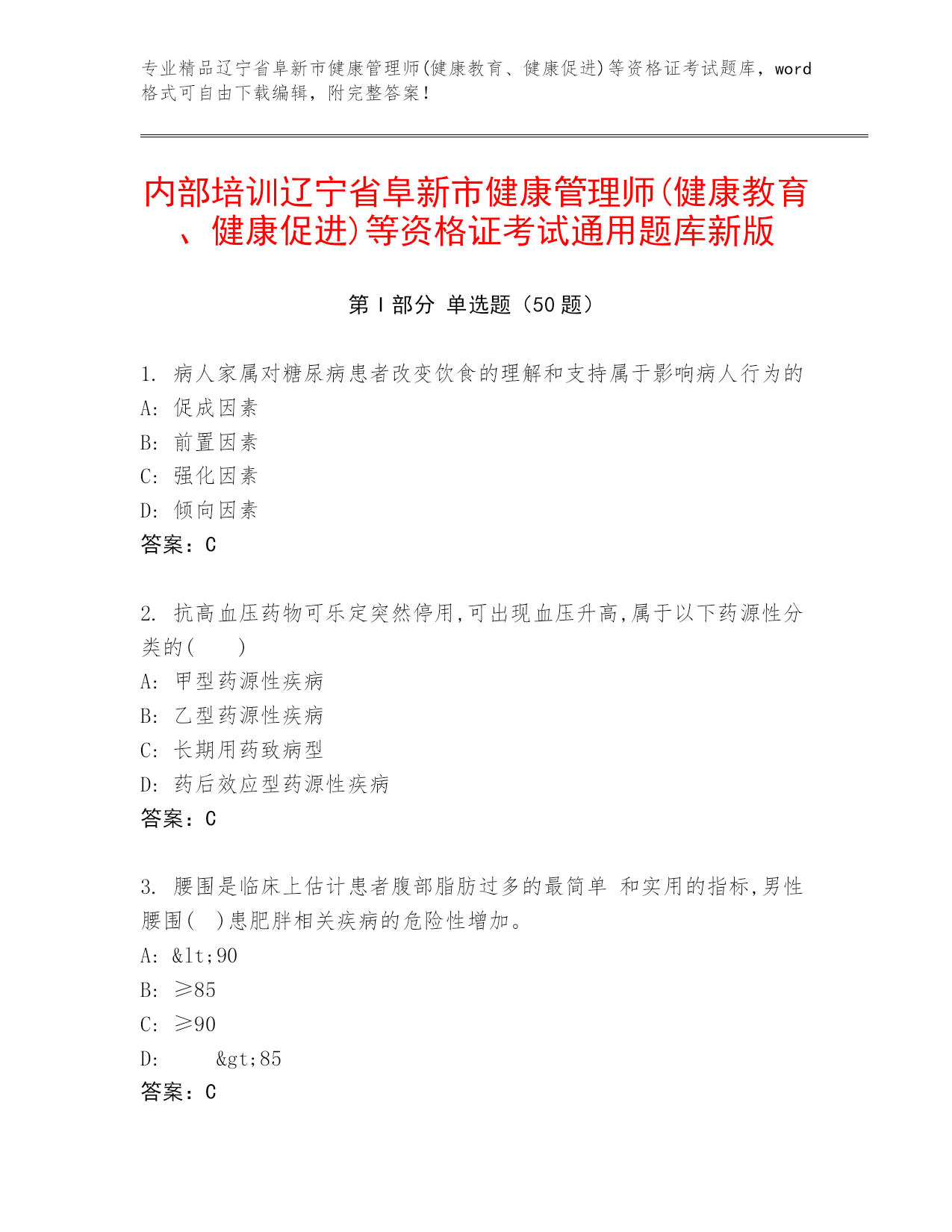 专业精品辽宁省阜新市健康管理师(健康教育、健康促进)等资格证考试题库,word格式可自由下载编辑,附完整答案!内部培训辽宁省阜新市健康管理师(健康教育、健康促进)等资格证考试通用题库新版第I部分单选题(50题)1.病人家属对糖尿病患者改变饮食的理解和支持属于影响病人行为的A:促成因素B:前置因素C:强化因素D:倾向因素答案:C2.抗高血压药物可乐定突然停用,可出现血压升高,属于以下药源性分类的()A:甲型药源性疾病B:乙型药源性疾病C:长期用药致病型D:药后效应型药源性疾病答案:C3.腰围是临床上估计患者
