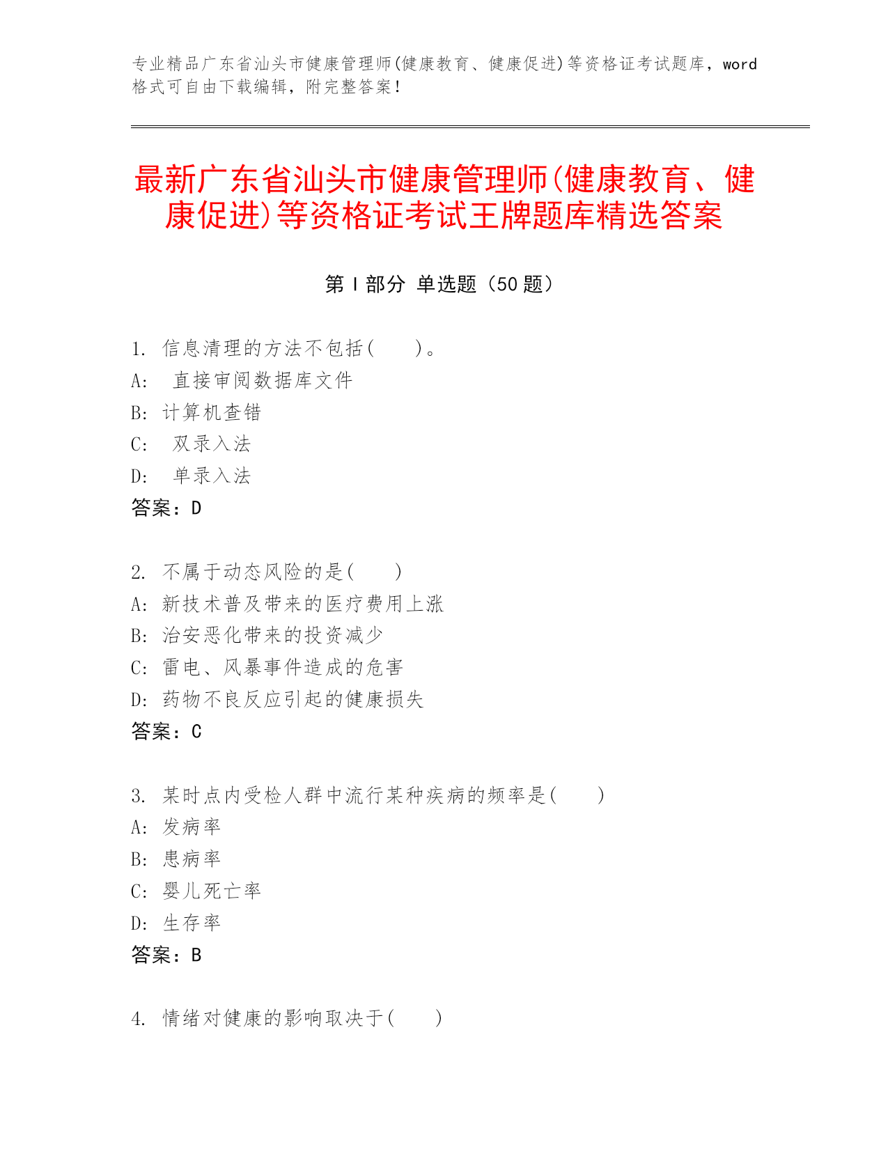 专业精品广东省汕头市健康管理师(健康教育、健康促进)等资格证考试题库,word格式可自由下载编辑,附完整答案!最新广东省汕头市健康管理师(健康教育、健康促进)等资格证考试王牌题库精选答案第I部分单选题(50题)1.信息清理的方法不包括()。A:直接审阅数据库文件B:计算机查错C:双录入法D:单录入法答案:D2.不属于动态风险的是()A:新技术普及带来的医疗费用上涨B:治安恶化带来的投资减少C:雷电、风暴事件造成的危害D:药物不良反应引起的健康损失答案:C3.某时点内受检人群中流行某种疾病的频率是()A:发