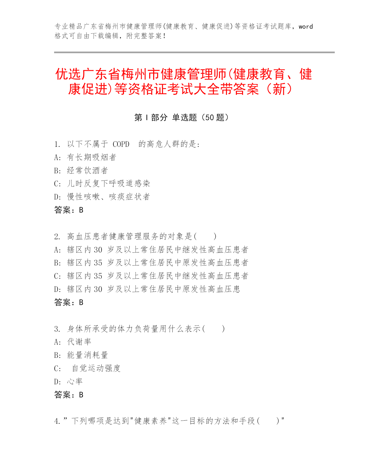 专业精品广东省梅州市健康管理师(健康教育、健康促进)等资格证考试题库,word格式可自由下载编辑,附完整答案!优选广东省梅州市健康管理师(健康教育、健康促进)等资格证考试大全带答案(新)第I部分单选题(50题)1.以下不属于COPD的高危人群的是:A:有长期吸烟者B:经常饮酒者C:儿时反复下呼吸道感染D:慢性咳嗽、咳痰症状者答案:B2.高血压患者健康管理服务的对象是()A:辖区内30岁及以上常住居民中继发性高血压患者B:辖区内35岁及以上常住居民中原发性高血压患者C:辖区内35岁及以上常住居民中继发性高血