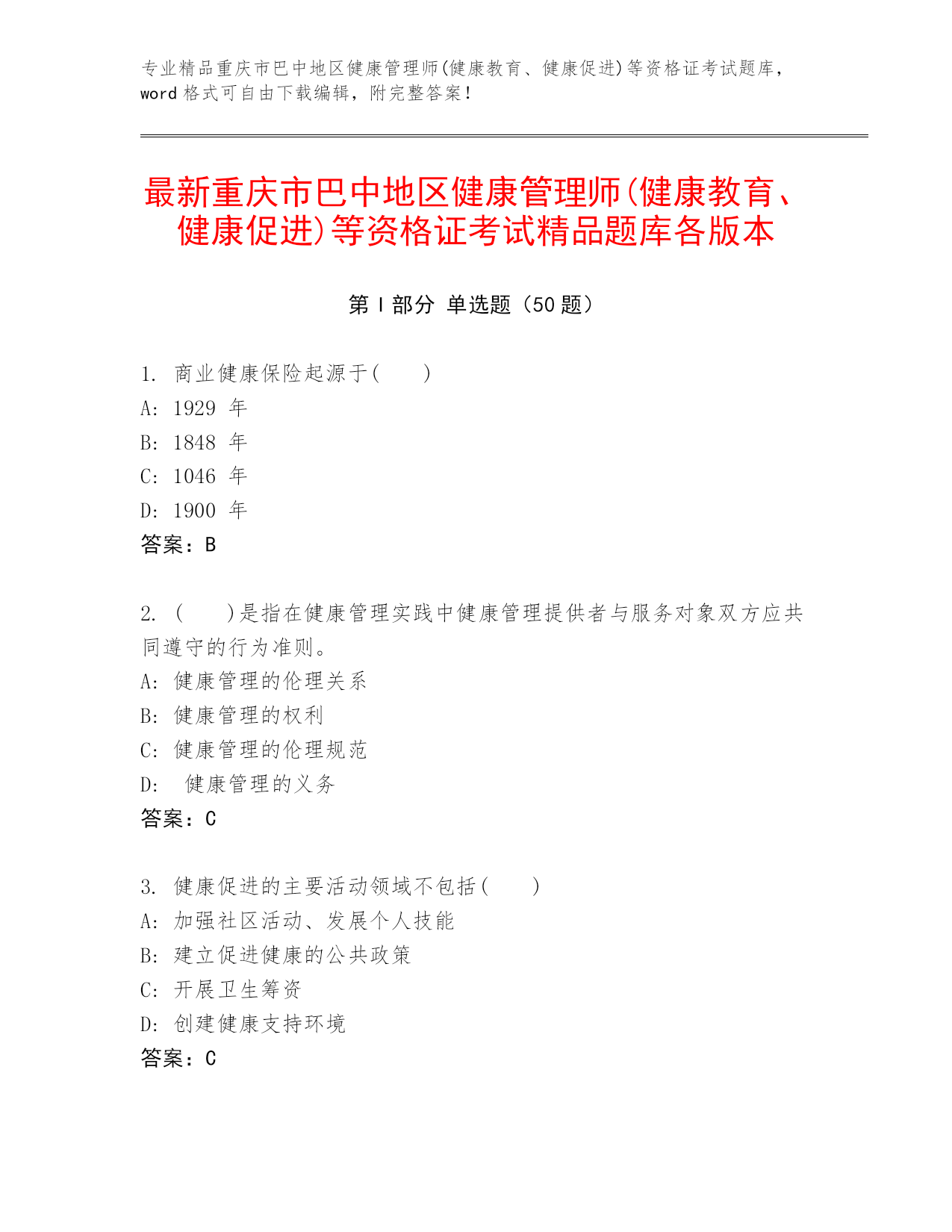 专业精品重庆市巴中地区健康管理师(健康教育、健康促进)等资格证考试题库,word格式可自由下载编辑,附完整答案!最新重庆市巴中地区健康管理师(健康教育、健康促进)等资格证考试精品题库各版本第I部分单选题(50题)1.商业健康保险起源于()A:1929年B:1848年C:1046年D:1900年答案:B2.()是指在健康管理实践中健康管理提供者与服务对象双方应共同遵守的行为准则。A:健康管理的伦理关系B:健康管理的权利C:健康管理的伦理规范D:健康管理的义务答案:C3.健康促进的主要活动领域不包括()A:加