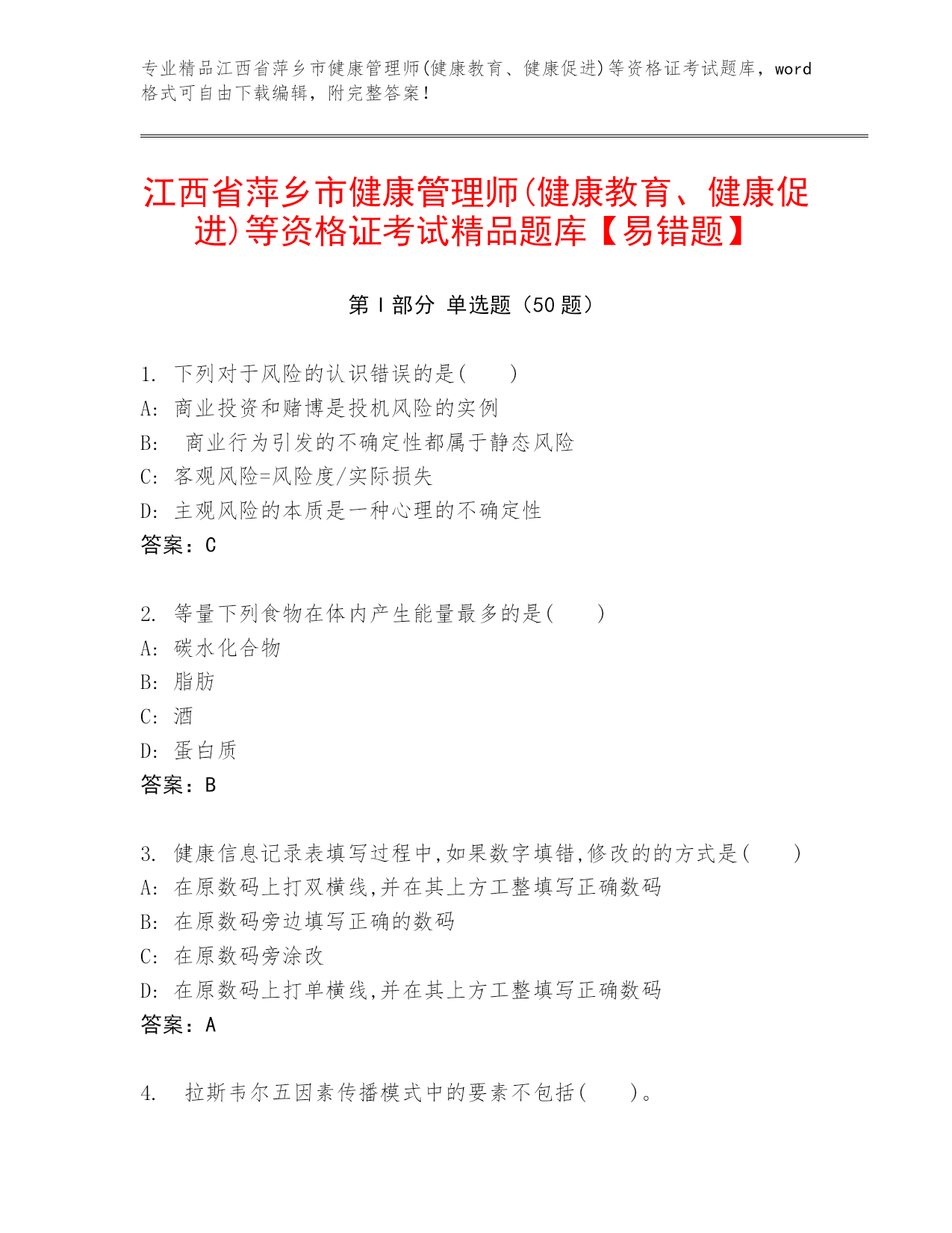 专业精品江西省萍乡市健康管理师(健康教育、健康促进)等资格证考试题库,word格式可自由下载编辑,附完整答案!江西省萍乡市健康管理师(健康教育、健康促进)等资格证考试精品题库【易错题】第I部分单选题(50题)1.下列对于风险的认识错误的是()A:商业投资和赌博是投机风险的实例B:商业行为引发的不确定性都属于静态风险C:客观风险=风险度/实际损失D:主观风险的本质是一种心理的不确定性答案:C2.等量下列食物在体内产生能量最多的是()A:碳水化合物B:脂肪C:酒D:蛋白质答案:B3.健康信息记录表填写过程中,