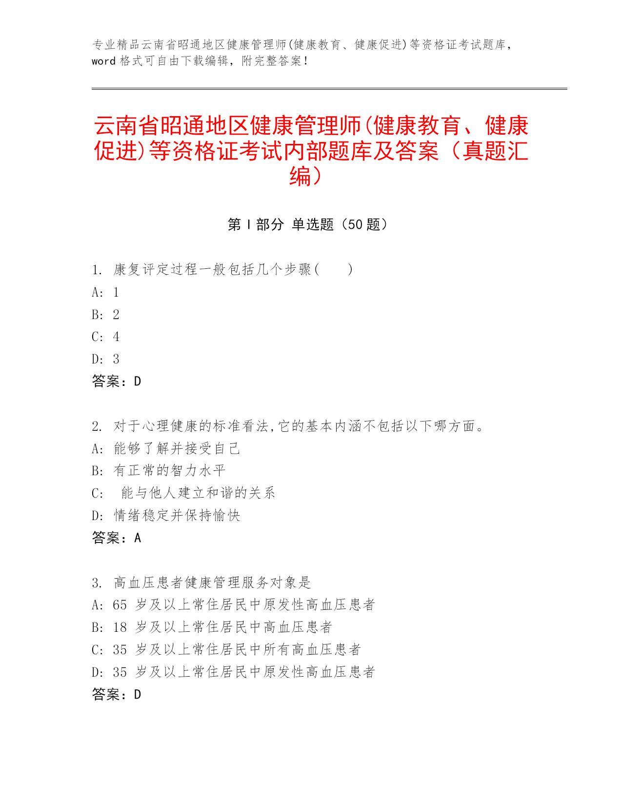 专业精品云南省昭通地区健康管理师(健康教育、健康促进)等资格证考试题库,word格式可自由下载编辑,附完整答案!云南省昭通地区健康管理师(健康教育、健康促进)等资格证考试内部题库及答案(真题汇编)第I部分单选题(50题)1.康复评定过程一般包括几个步骤()A:1B:2C:4D:3答案:D2.对于心理健康的标准看法,它的基本内涵不包括以下哪方面。A:能够了解并接受自己B:有正常的智力水平C:能与他人建立和谐的关系D:情绪稳定并保持愉快答案:A3.高血压患者健康管理服务对象是A:65岁及以上常住居民中原发性高