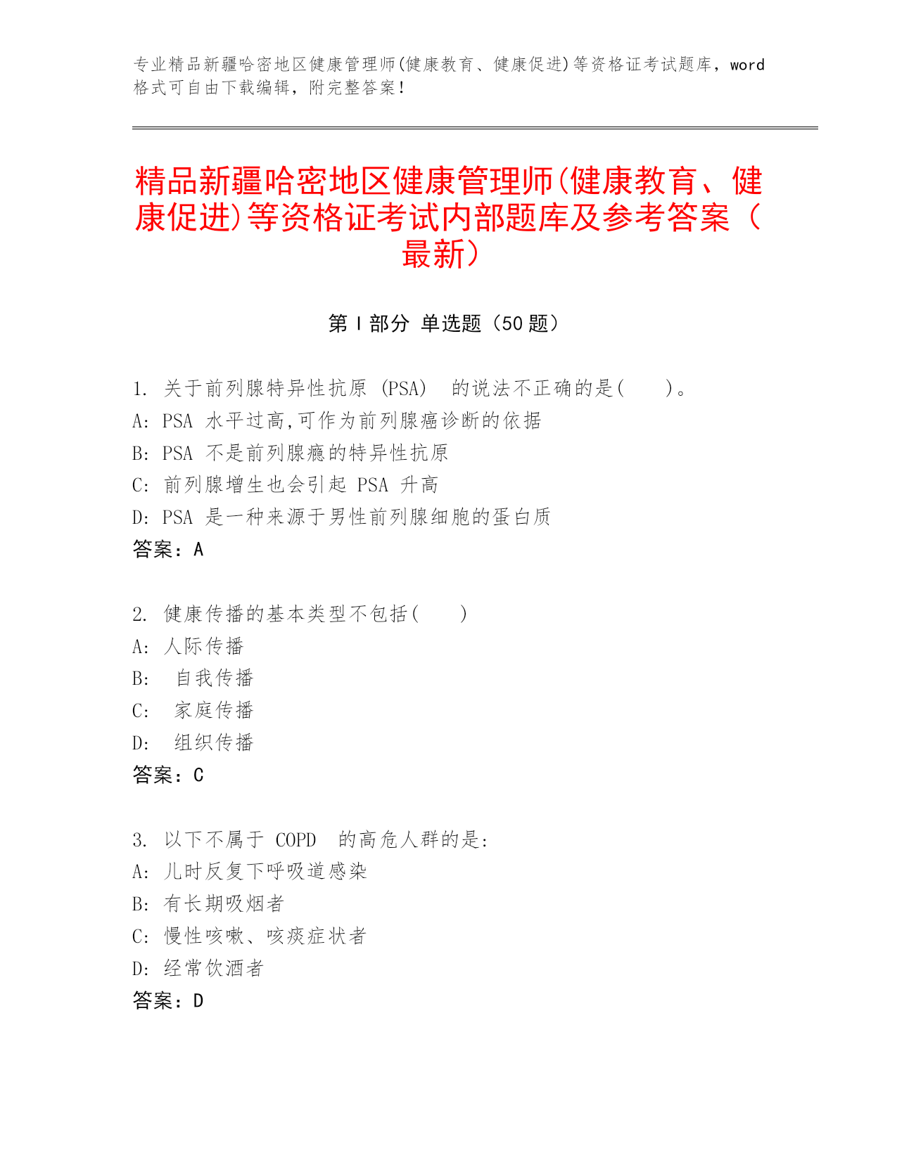 专业精品新疆哈密地区健康管理师(健康教育、健康促进)等资格证考试题库,word格式可自由下载编辑,附完整答案!精品新疆哈密地区健康管理师(健康教育、健康促进)等资格证考试内部题库及参考答案(最新)第I部分单选题(50题)1.关于前列腺特异性抗原(PSA)的说法不正确的是()。A:PSA水平过高,可作为前列腺癌诊断的依据B:PSA不是前列腺瘾的特异性抗原C:前列腺增生也会引起PSA升高D:PSA是一种来源于男性前列腺细胞的蛋白质答案:A2.健康传播的基本类型不包括()A:人际传播B:自我传播C:家庭传播D: