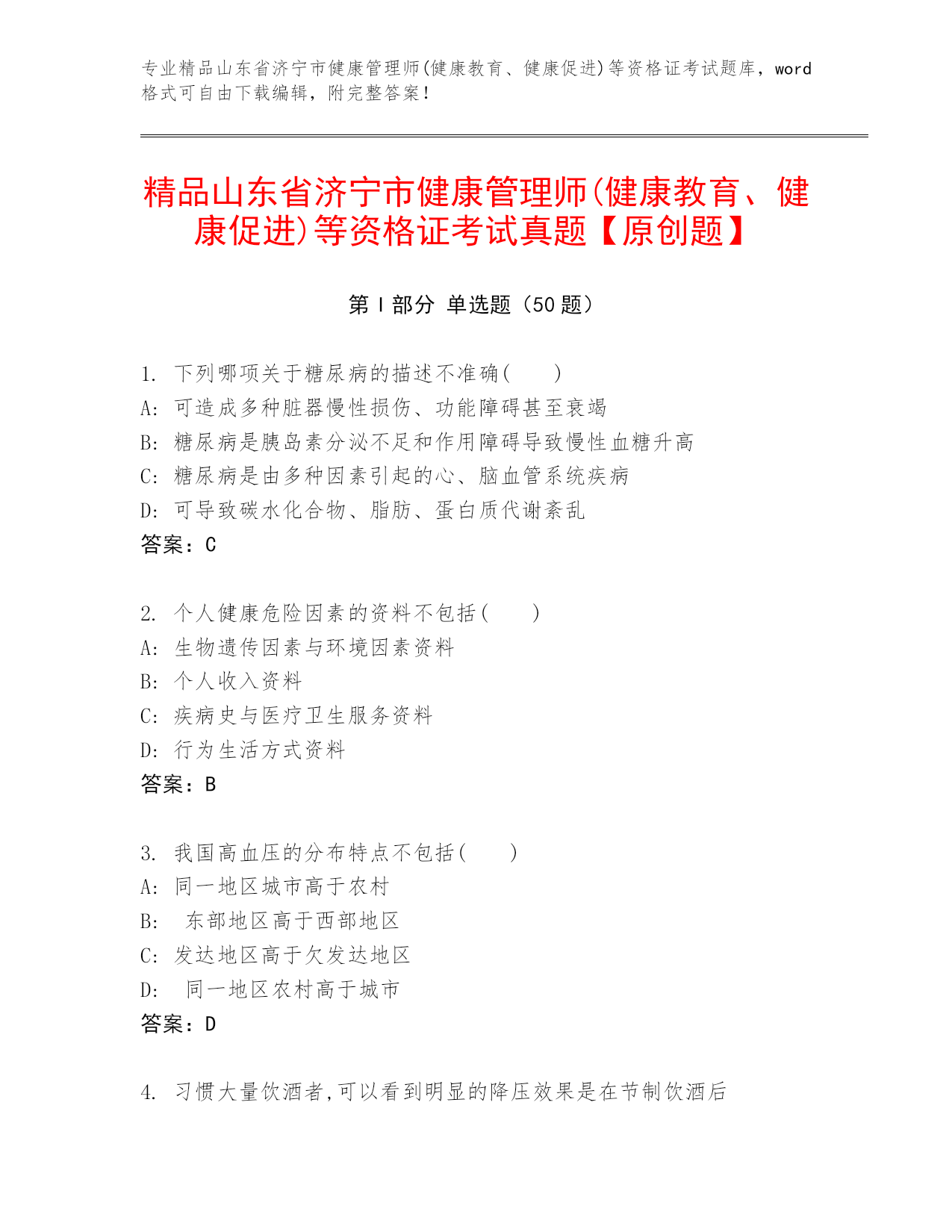 专业精品山东省济宁市健康管理师(健康教育、健康促进)等资格证考试题库,word格式可自由下载编辑,附完整答案!精品山东省济宁市健康管理师(健康教育、健康促进)等资格证考试真题【原创题】第I部分单选题(50题)1.下列哪项关于糖尿病的描述不准确()A:可造成多种脏器慢性损伤、功能障碍甚至衰竭B:糖尿病是胰岛素分泌不足和作用障碍导致慢性血糖升高C:糖尿病是由多种因素引起的心、脑血管系统疾病D:可导致碳水化合物、脂肪、蛋白质代谢紊乱答案:C2.个人健康危险因素的资料不包括()A:生物遗传因素与环境因素资料B:个