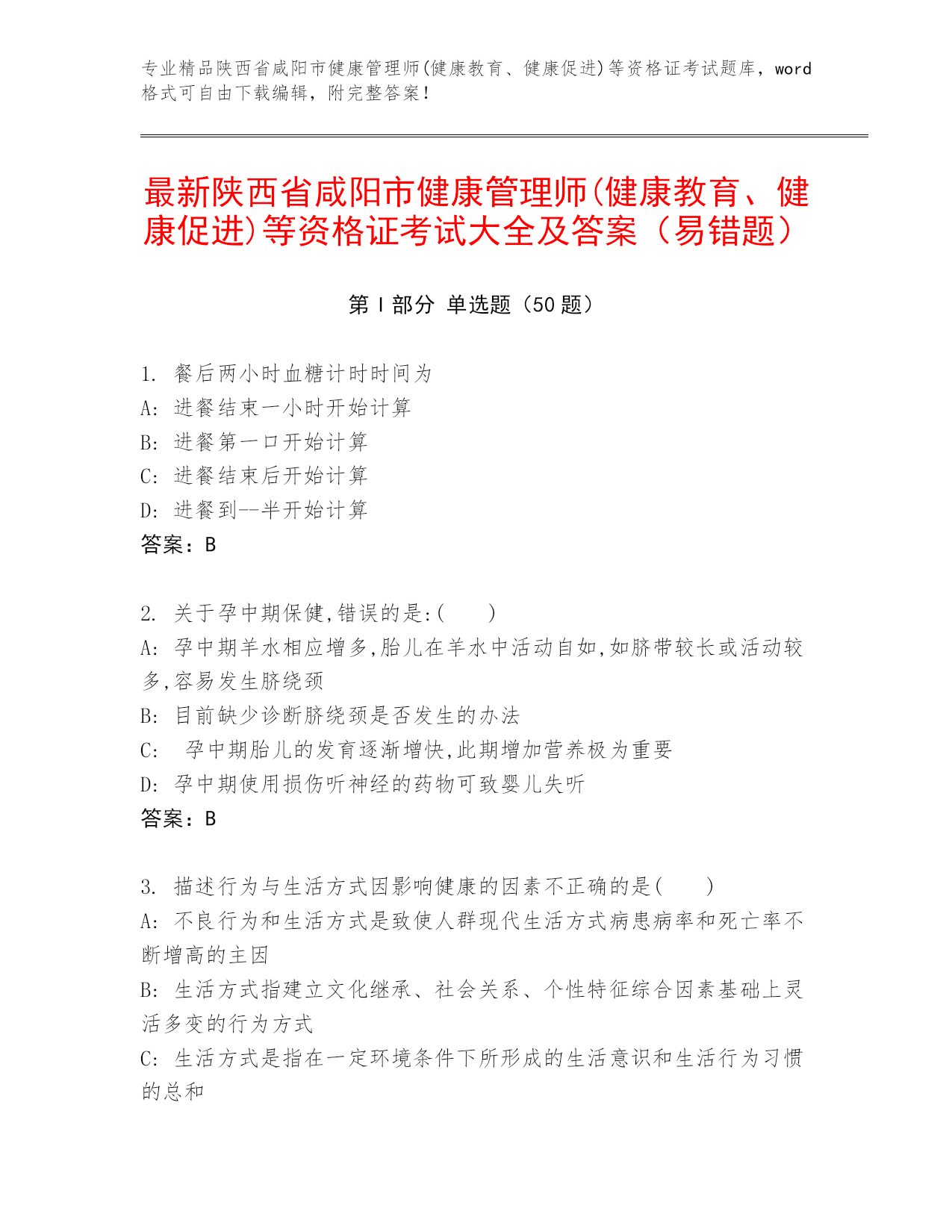 专业精品陕西省咸阳市健康管理师(健康教育、健康促进)等资格证考试题库,word格式可自由下载编辑,附完整答案!最新陕西省咸阳市健康管理师(健康教育、健康促进)等资格证考试大全及答案(易错题)第I部分单选题(50题)1.餐后两小时血糖计时时间为A:进餐结束一小时开始计算B:进餐第一口开始计算C:进餐结束后开始计算D:进餐到--半开始计算答案:B2.关于孕中期保健,错误的是:()A:孕中期羊水相应增多,胎儿在羊水中活动自如,如脐带较长或活动较多,容易发生脐绕颈B:目前缺少诊断脐绕颈是否发生的办法C:孕中期胎儿