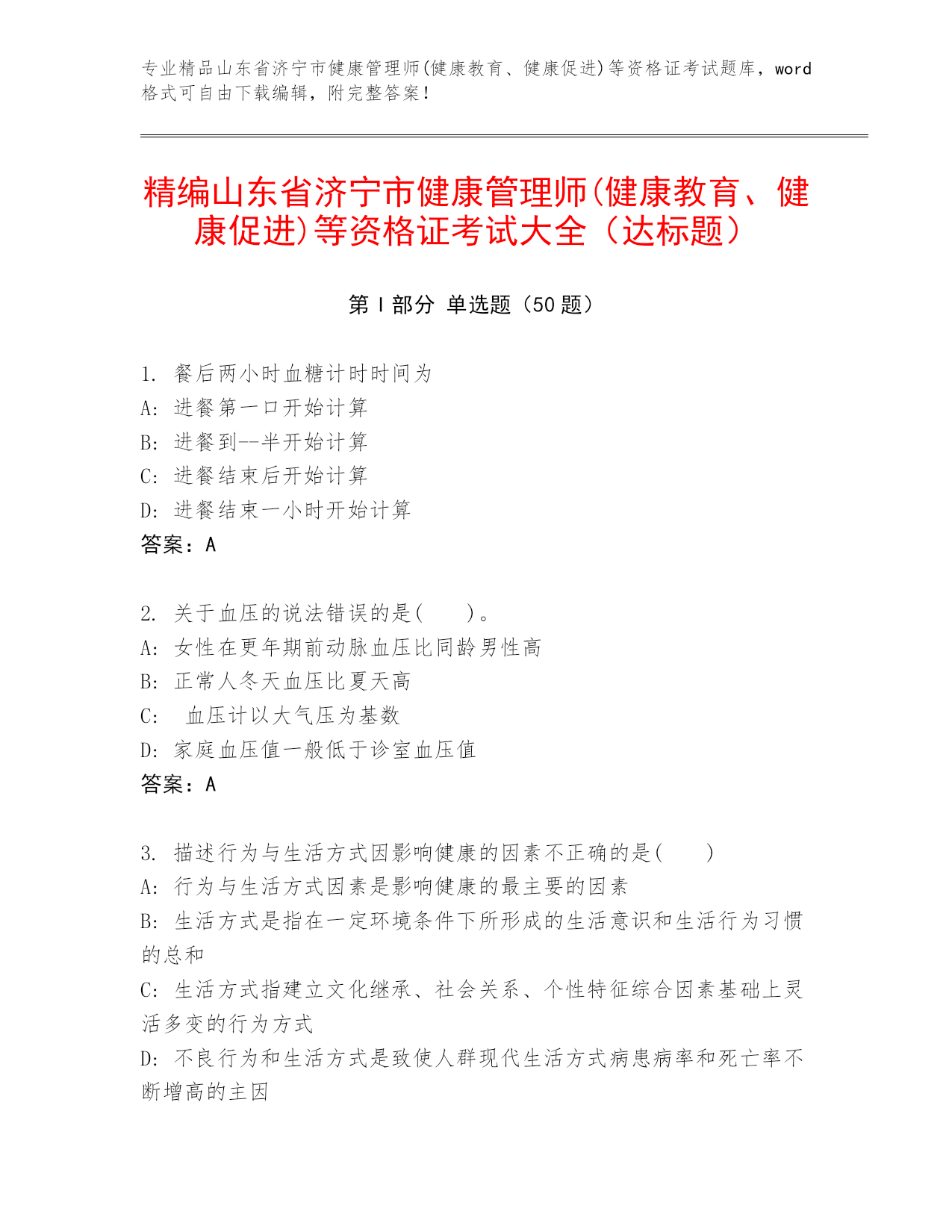 专业精品山东省济宁市健康管理师(健康教育、健康促进)等资格证考试题库,word格式可自由下载编辑,附完整答案!精编山东省济宁市健康管理师(健康教育、健康促进)等资格证考试大全(达标题)第I部分单选题(50题)1.餐后两小时血糖计时时间为A:进餐第一口开始计算B:进餐到--半开始计算C:进餐结束后开始计算D:进餐结束一小时开始计算答案:A2.关于血压的说法错误的是()。A:女性在更年期前动脉血压比同龄男性高B:正常人冬天血压比夏天高C:血压计以大气压为基数D:家庭血压值一般低于诊室血压值答案:A3.描述行为